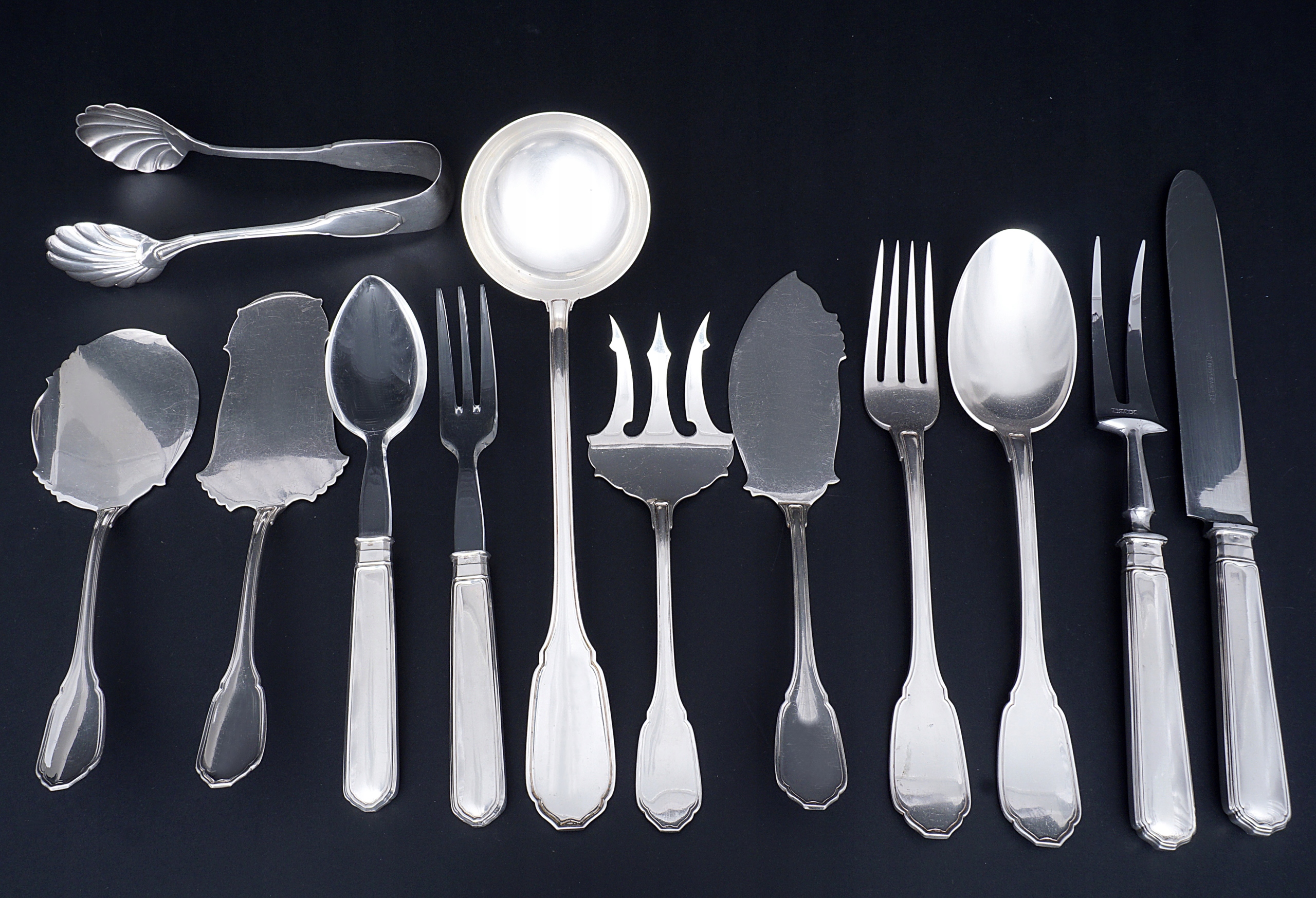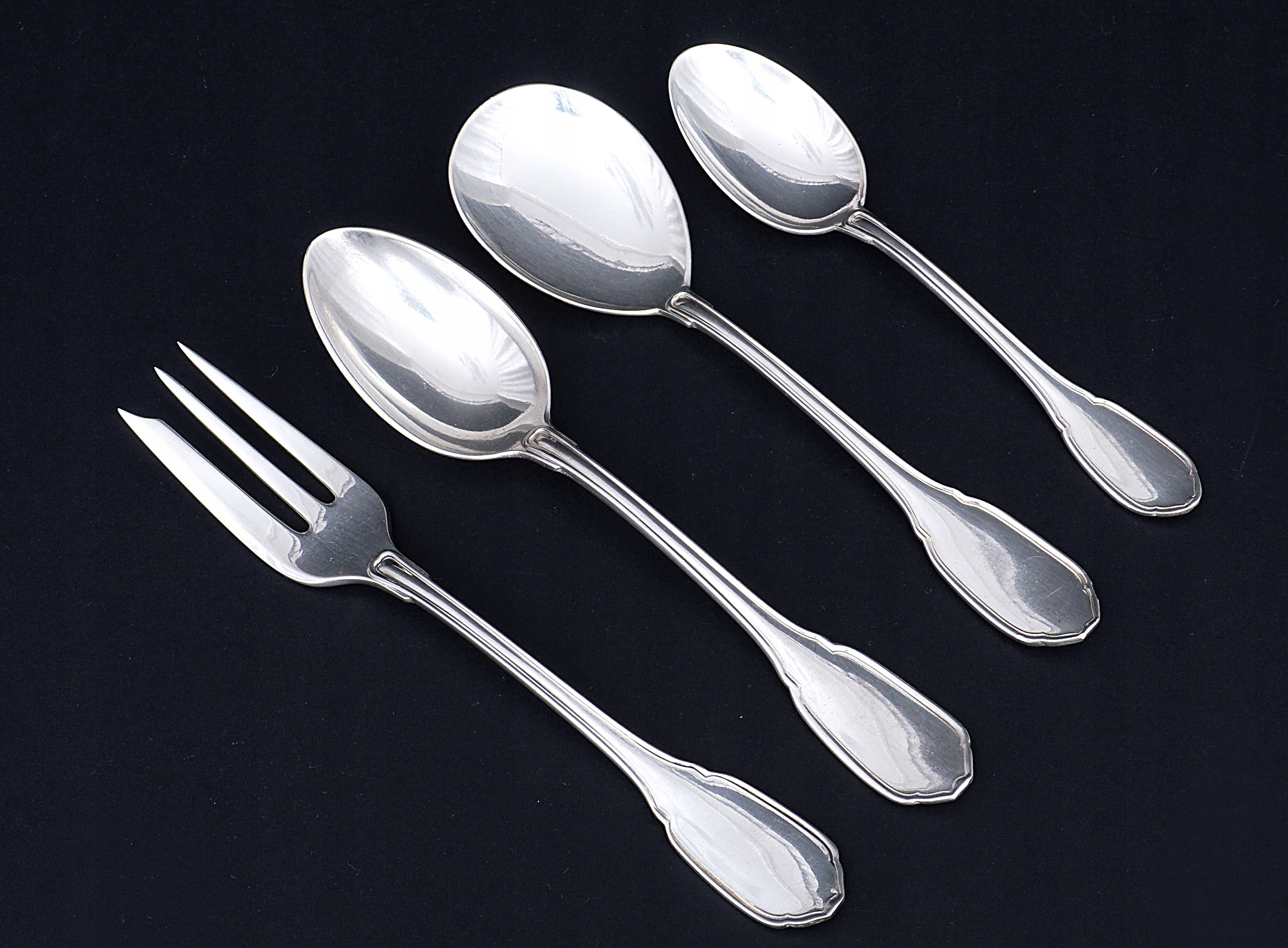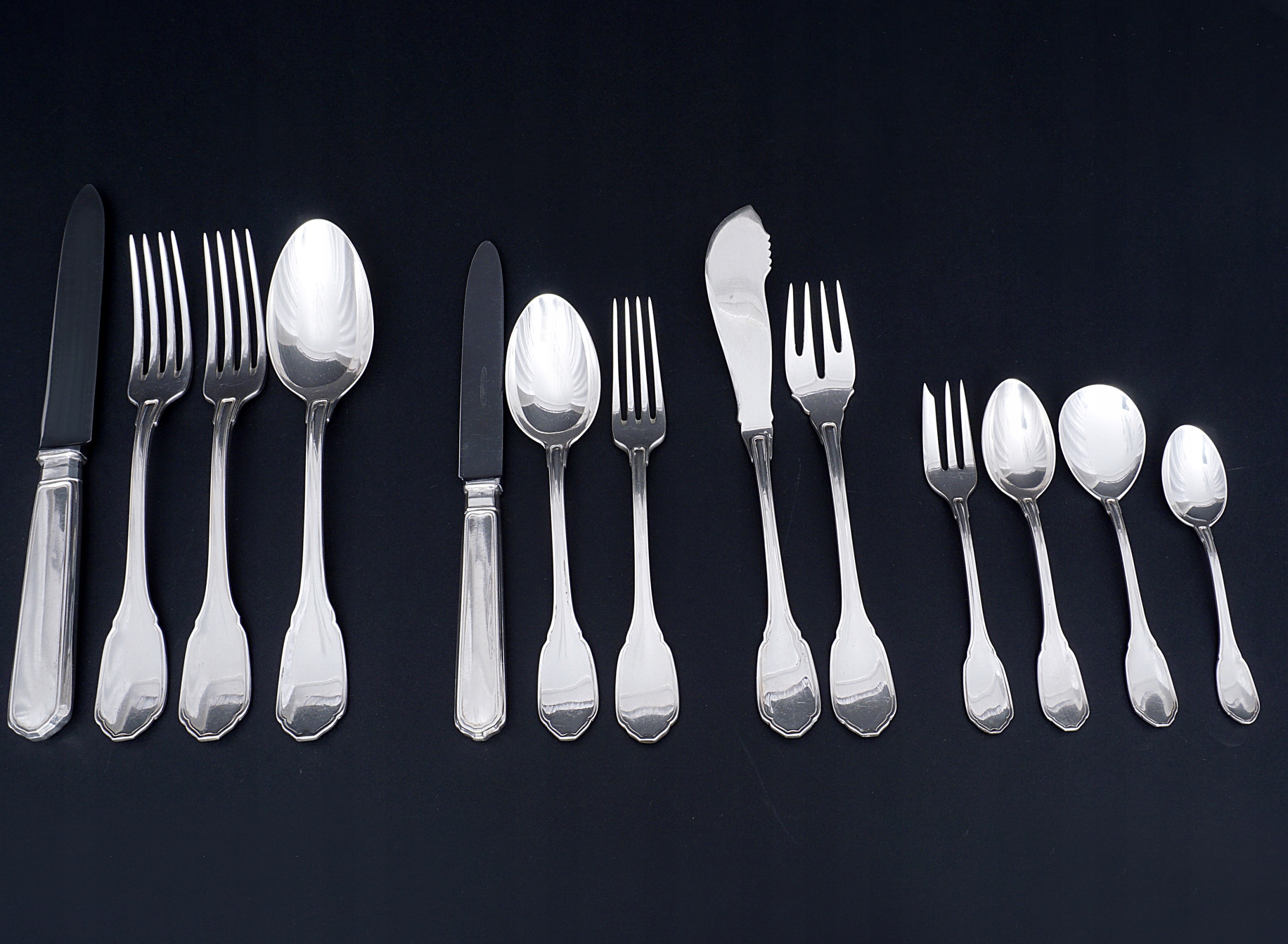 Набор столовых приборов на 12 персон из серебра 800 пробы.
