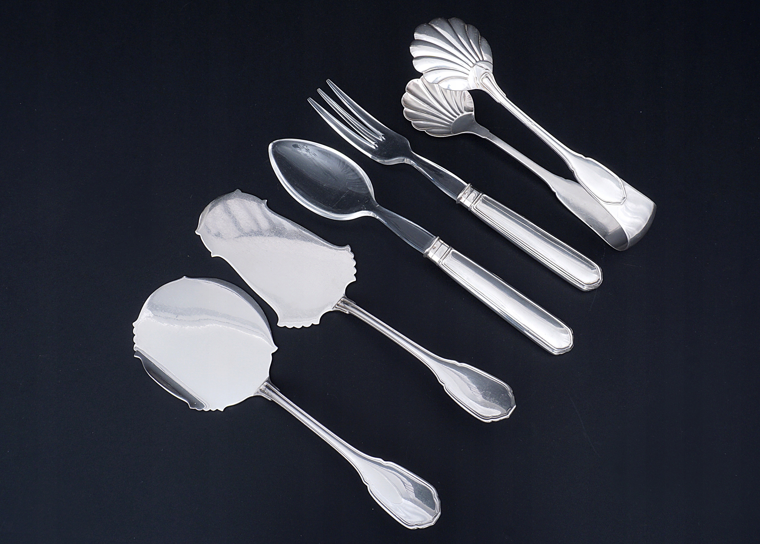 *12 частей - см. фото - 1773 грамм - ложка, столовые приборы для салата, столовые приборы для рыбы, столовые приборы для мяса, щипцы, ложка + вилка сервировочная