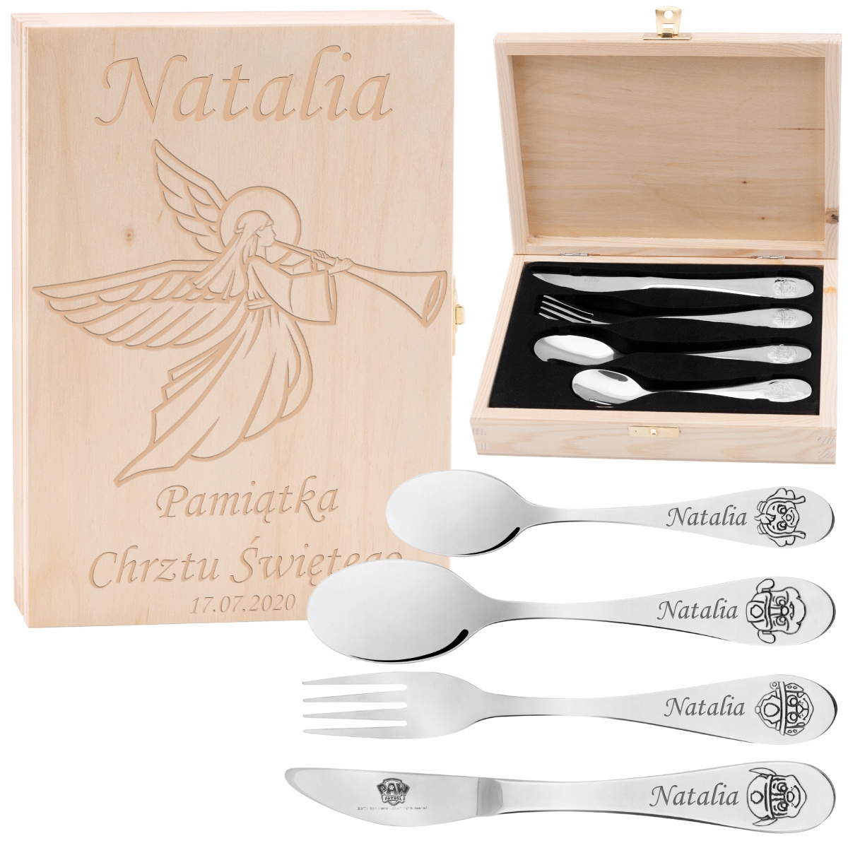 Детские столовые приборы/Щенячий патруль/Деревянный футляр/Своя гравировка/Сувенир на Крещение