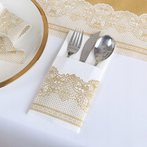 - Столько же в виде 25 столовых приборов из нетканого материала с карманами для столовых приборовбелого цвета, украшенных золотым кружевным мотивом