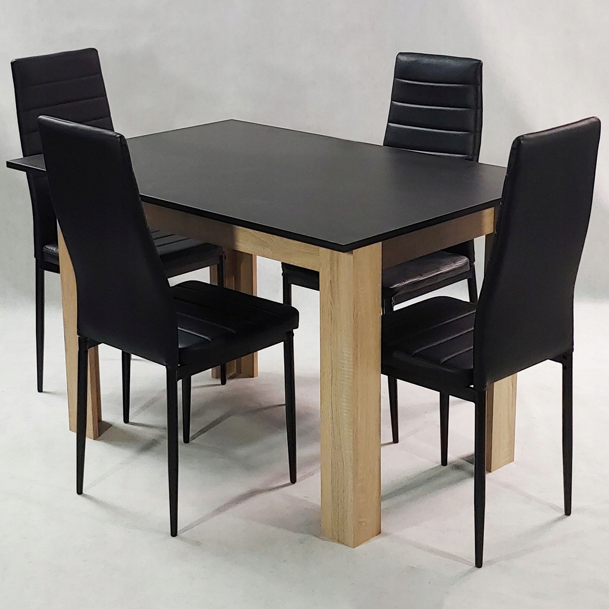 Исключительно элегантный и чрезвычайно практичный столовый набор будет хорошо смотреться в классических и современных кухнях или столовых. Простота изготовления – универсальная особенность, благодаря которой набор можно успешно использовать в различных аранжировках. Отличительной особенностью набора является его прочное и долговечное исполнение. Комплект состоит из прямоугольного стола и 4 массивных стульев. Стол изготовлен из ламинированной плиты, основания из дуба Сонома и черной столешницы. В стульях использован классический каркас из черного металла, обитый эко-кожей. Этот набор привлечет внимание покупателей, ценящих универсальные и очень функциональные решения.
