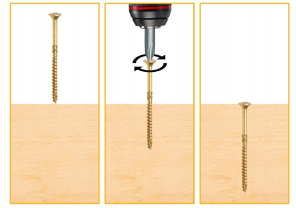 Проводящиеся винты с конической головкой используются при соединении элементов из дерева. Винты полностью заменяют ногти здания и не требуют бурения. Их использование гарантирует прочную и прочную связь. Специальный дизайн лезвия предотвращает растрескивание древесины и устраняет предварительную обработку. Нить, оснащенная сокращением штрафов, хорошо в дереве. Открытый резак расширяет отверстие в древесине, благодаря которой привинчивание требует использования меньшего количества силы. Винты оснащены конической головкой с глубокими битами Torx.