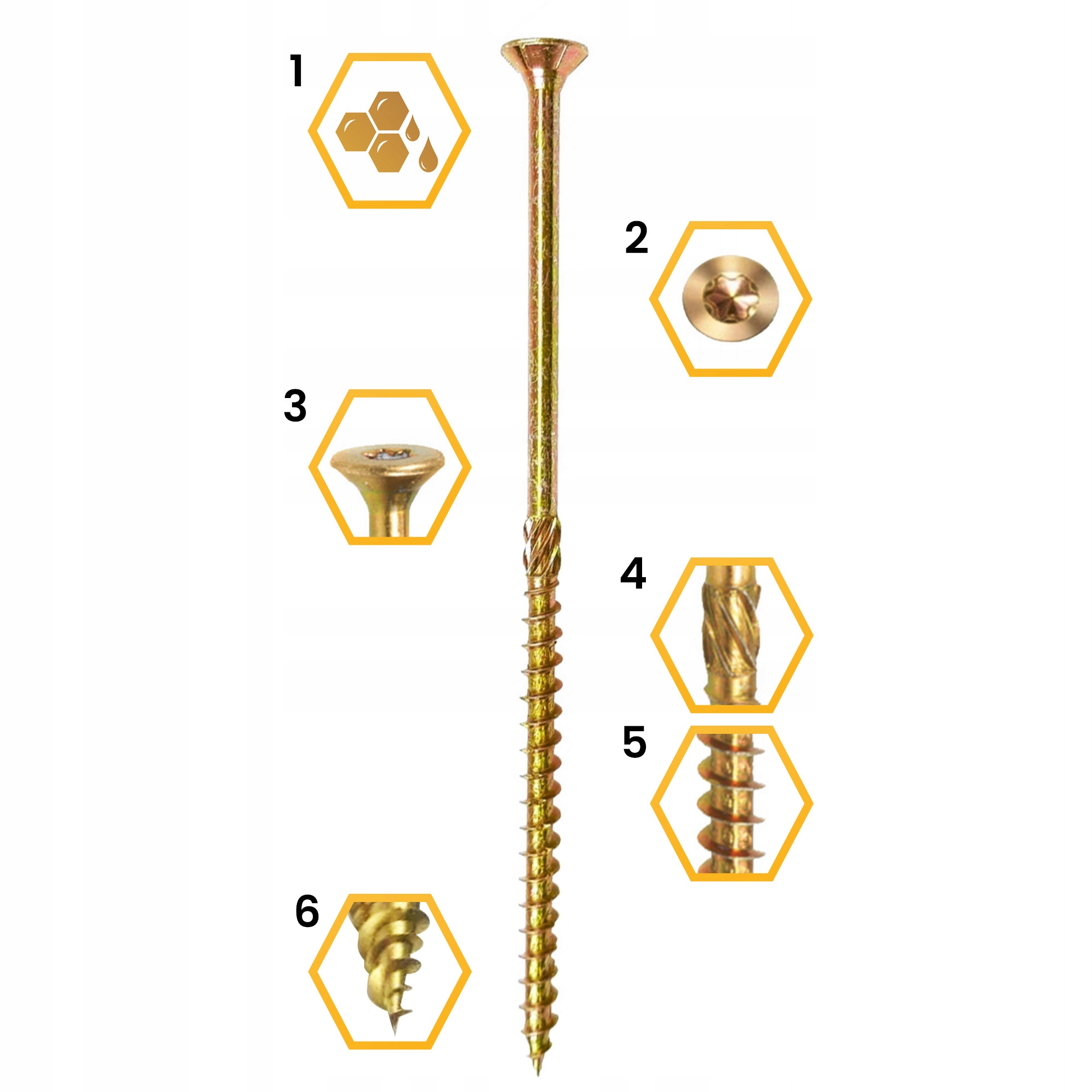 Проводящиеся винты с конической головкой используются при соединении элементов из дерева. Винты полностью заменяют ногти здания и не требуют бурения. Их использование гарантирует прочную и прочную связь. Специальный дизайн лезвия предотвращает растрескивание древесины и устраняет предварительную обработку. Нить, оснащенная сокращением штрафов, хорошо в дереве. Открытый резак расширяет отверстие в древесине, благодаря которой привинчивание требует использования меньшего количества силы. Винты оснащены конической головкой с глубокими битами Torx.
