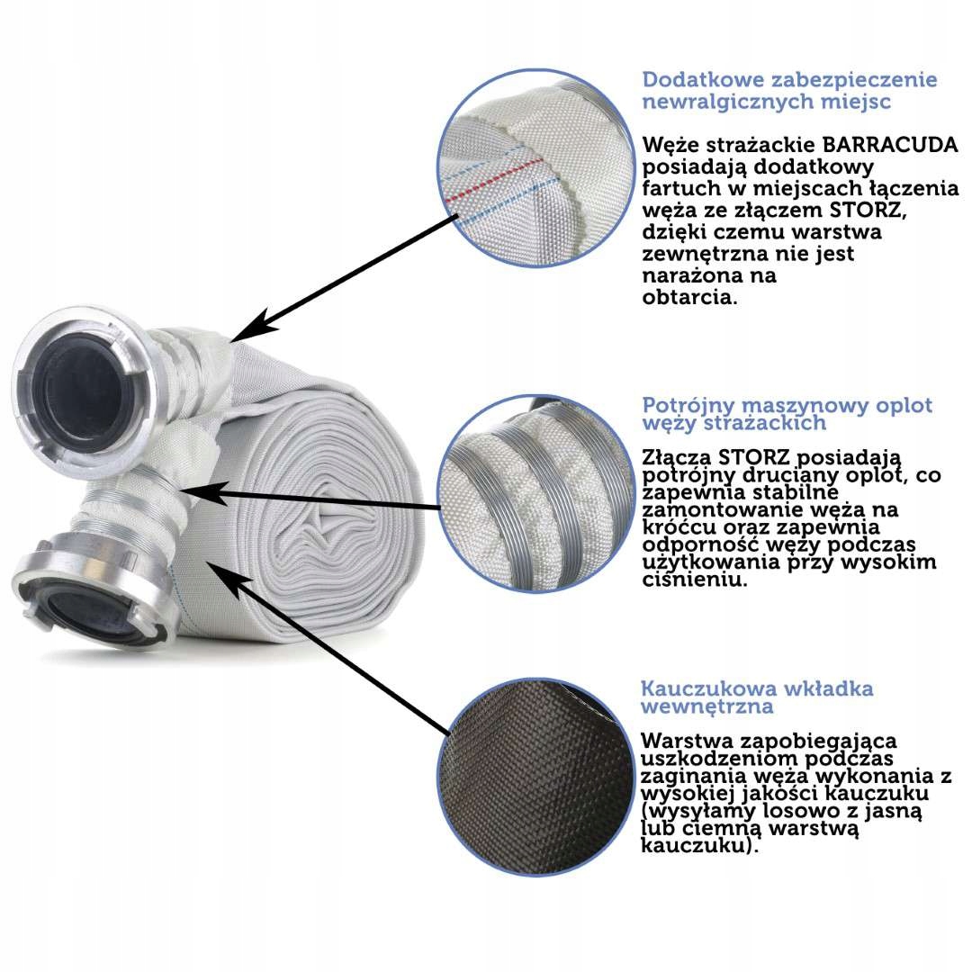 Пожарные рукава BARRACUDA имеют дополнительный фартук в местах присоединения шланга к разъему STORZ, благодаря чему внешний слой не подвергается истиранию.