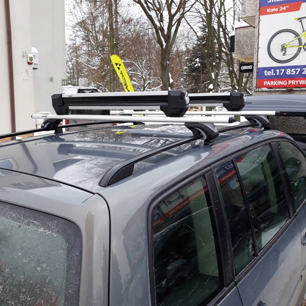 Ручка для транспортировки 6 пар лыж или 4 сноубордных плат на крыше автомобиля. Монтируется на алюминиевых балках с помощью T-канавки и на балках стандартной стали 33x22 мм. Лыжи и сноубордисты затянуты безопасным образом между челюстями из гибких режимов, что позволяет транспортировать оборудование даже в крышках (особенно рекомендуется для долгого внимания к грязи на привязках).