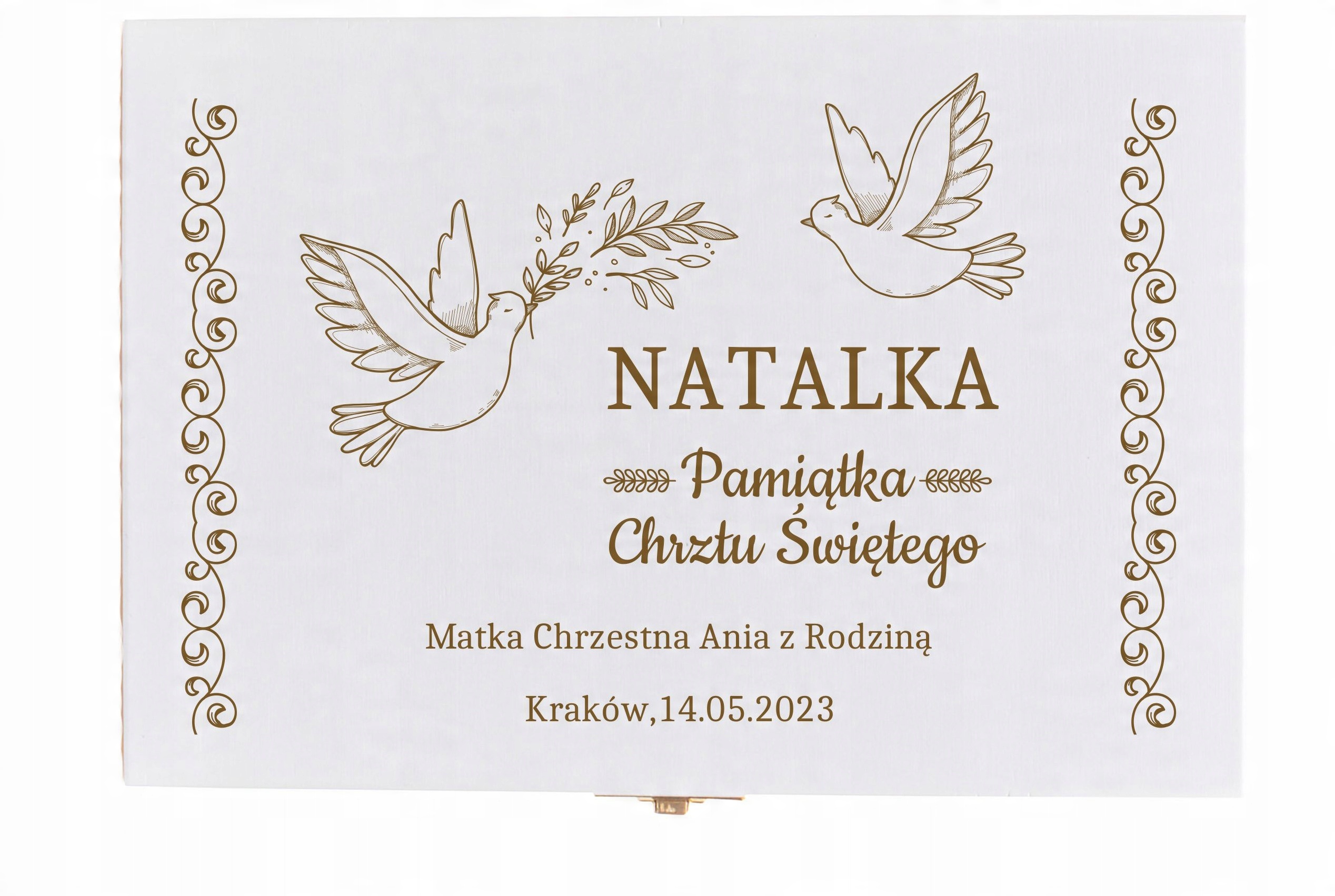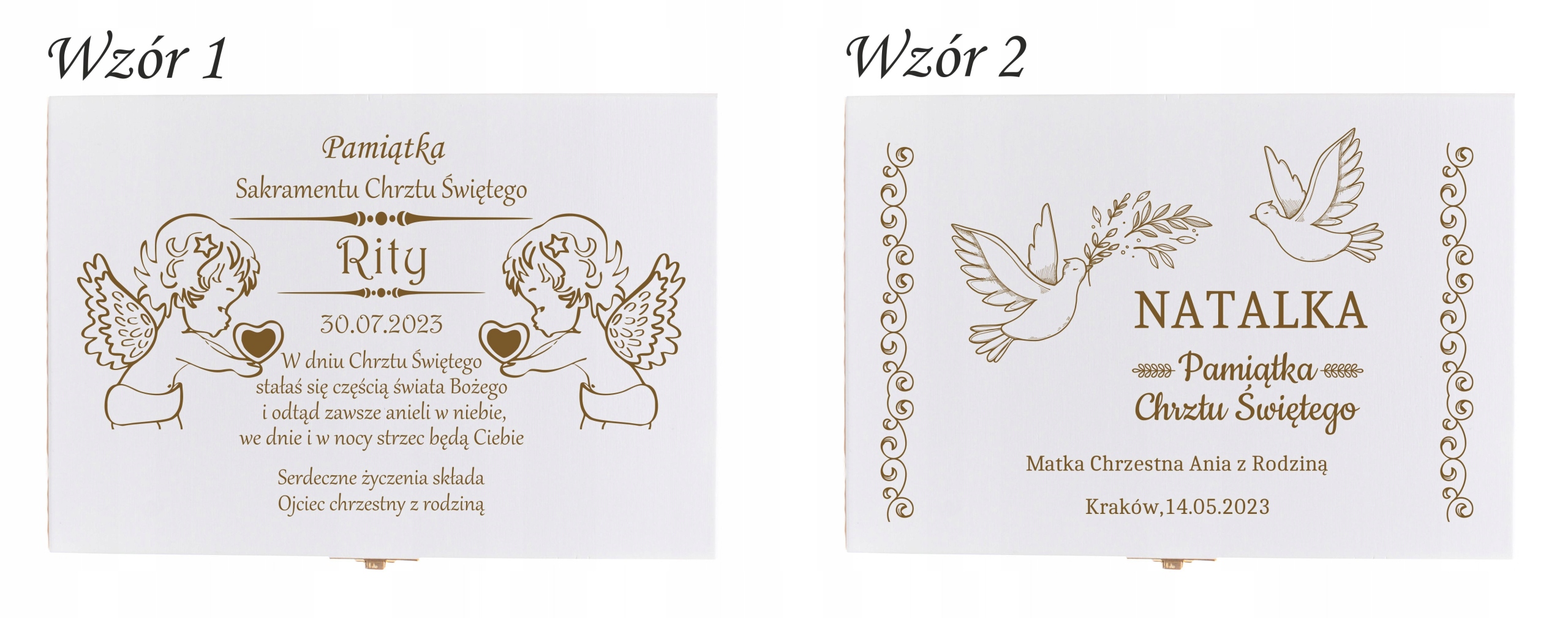 Детские столовые приборы, помещенные в деревянную коробку, – интересная идея подарка на крещение или день рождения. В комплект входят качественные вилка, нож, ложка и чайная ложка. Декоративные столовые приборы для детей станут приятным дополнением к трапезе даже самому привередливому едоку. Дополнительно мы можем выгравировать на всех элементах указанную вами гравировку – например, имя вашего ребенка. На крышке коробки мы можем выгравировать индивидуальное посвящение по шаблонам, подготовленным ниже.
