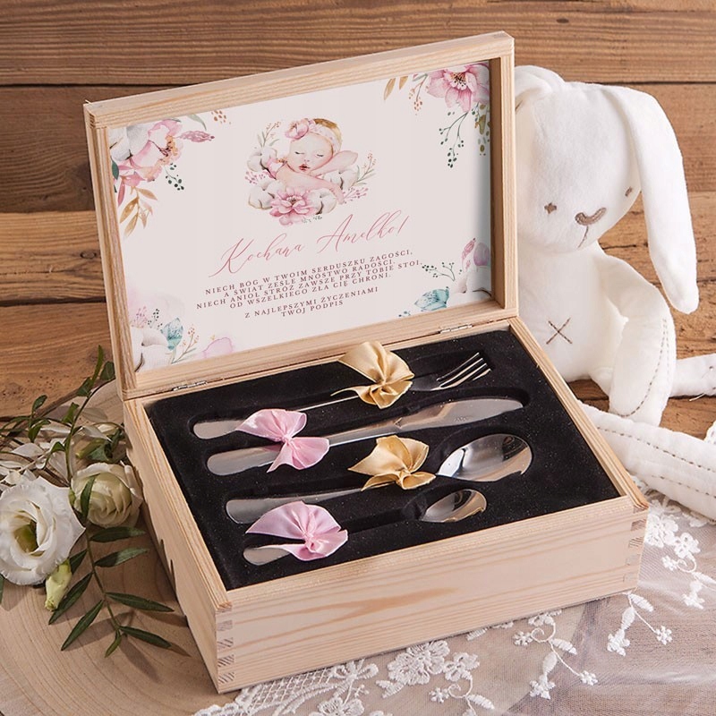 - набор стальных детских столовых приборов, помещенный в деревянный ящик; столовые приборы перевязаны золотыми и розовыми бантиками.