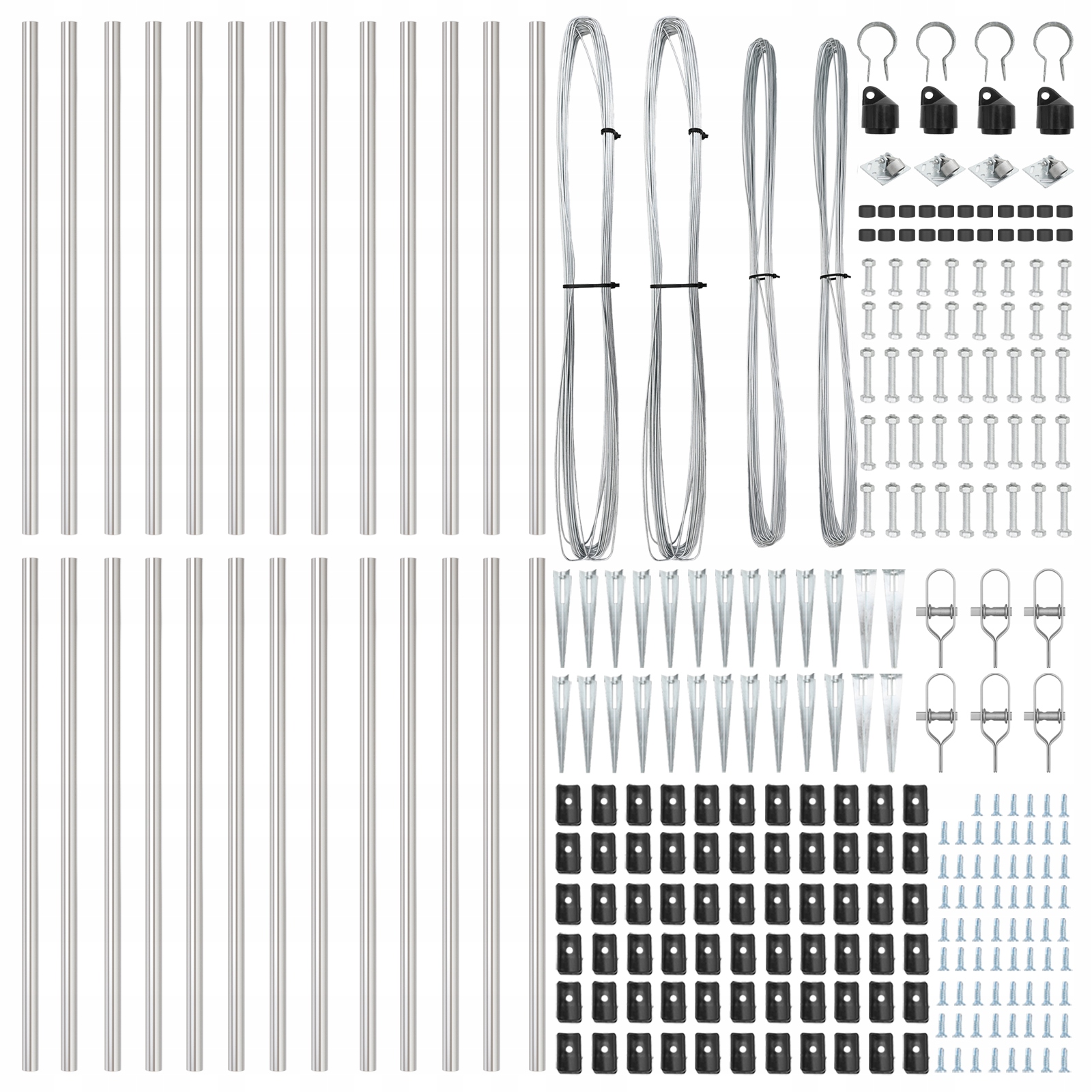 - В комплект поставки: 22 стойки, 4 угловых стойки, 22 шт. Шип, 4 угловых шипа, 22 пластиковых колпачка, 66 пластиковых держателей натяжного троса, 66 бригад на пластиковом держателе, 4 колпачка угловой стойки, 4 крепежных элемента угловой стойки, 4 крепежных винта угловой стойки M6X25, 52 винта с наружной частью M6X40, 6 натяжных устройств, 2 связующих провода длиной 25 м, натяжитель 2 x 80 м Проволока