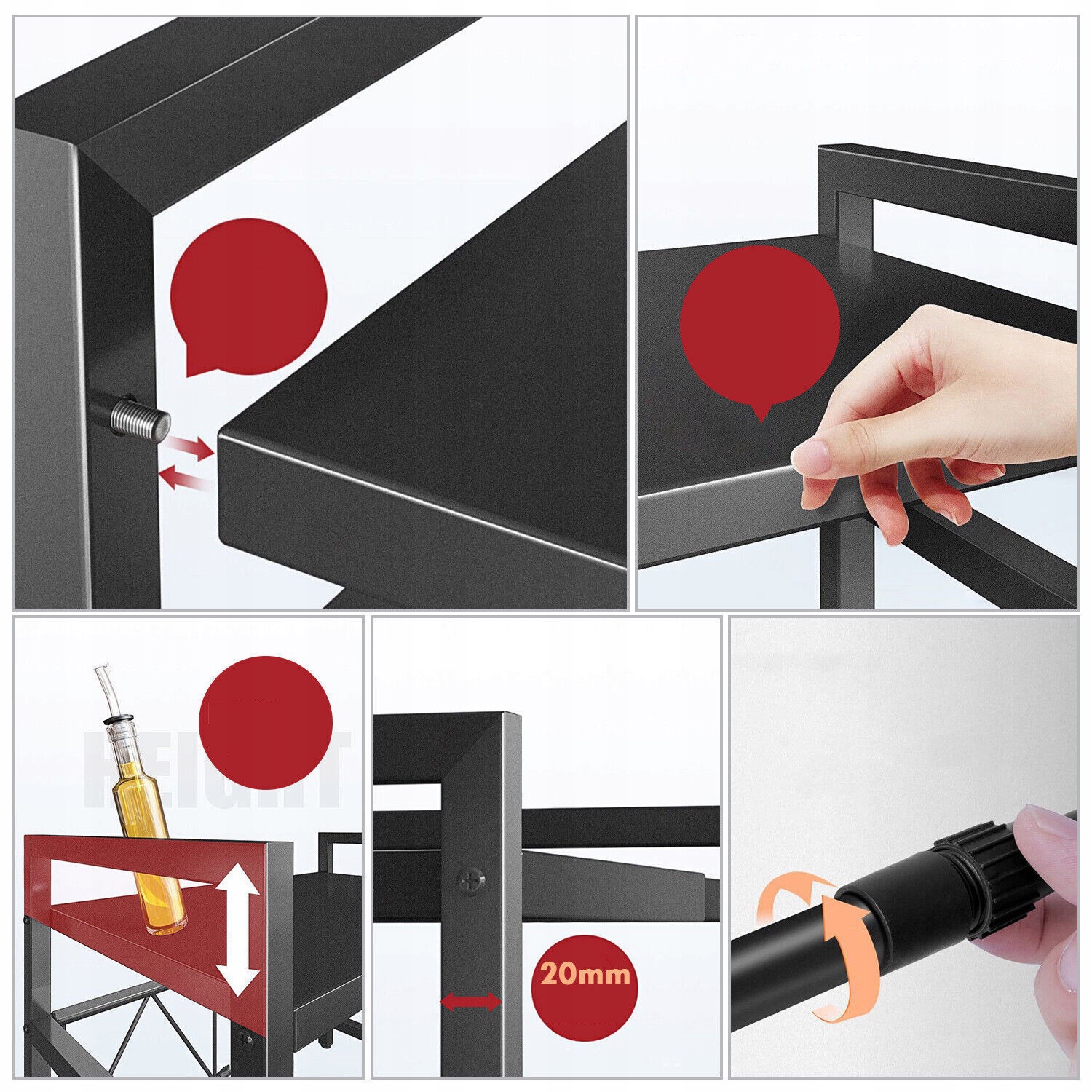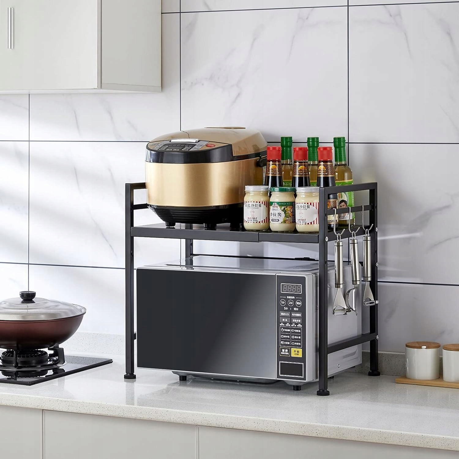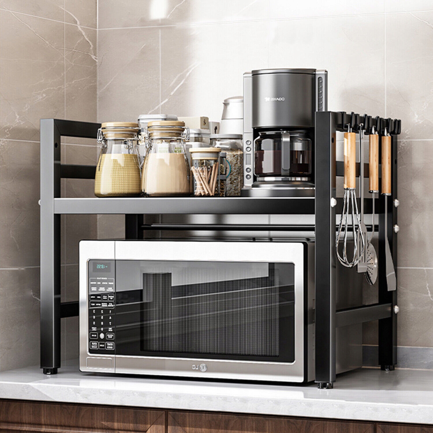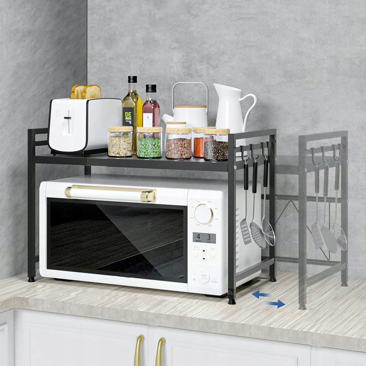☀ 【2-ступенчатая стойка для хранения】 Регулируемая длина в диапазоне 40-64 см, высота: 43 см, ширина: 40 см. Выдвижная микроволновая печь обеспечивает дополнительное место для хранения благодаря простой регулировке ручки и может быть легко адаптирована к размеру практически любой микроволновой печи. грузоподъемность.