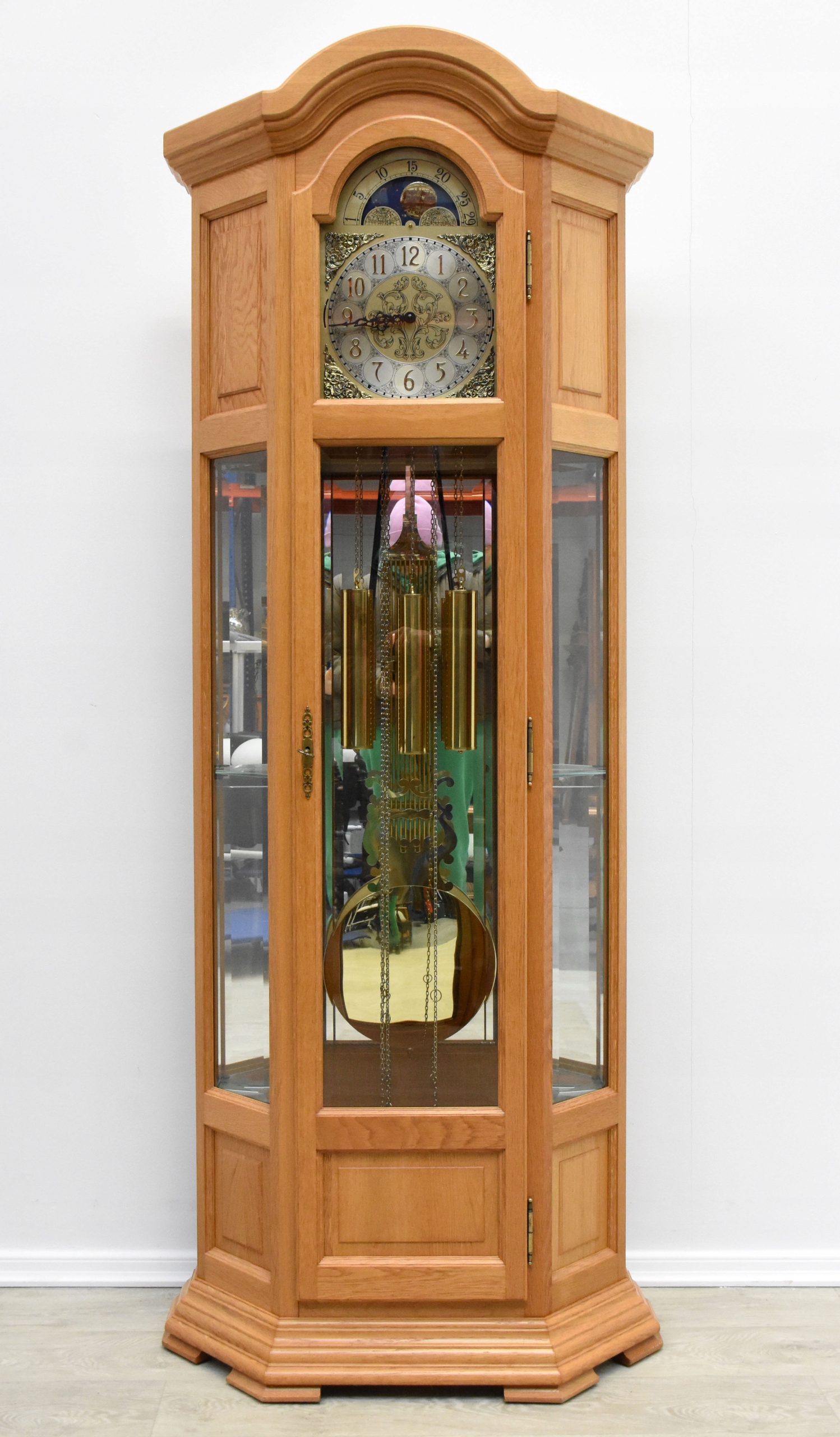 Постоянные часы, немецкое происхождение, возраст около 40 лет, функциональный механизм. Веса и латунный маятник Золотой цвет, эффективный блокировка плюс 1 клавиша, межблонную бренд, 8 струн, очарованная дверь, освещенная в середине