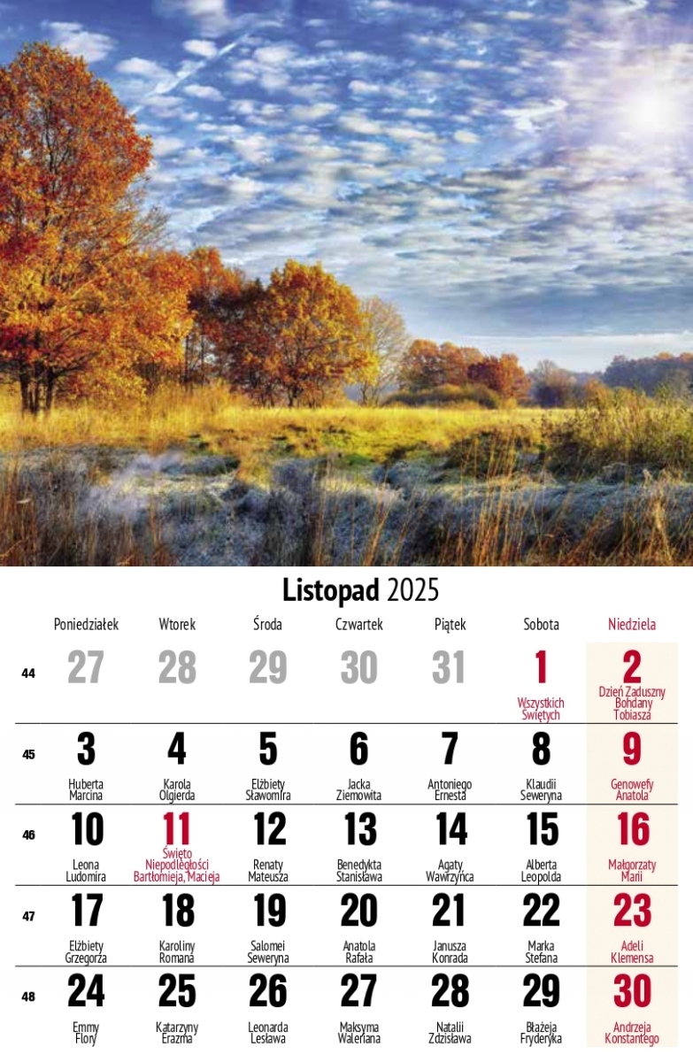 Место для заметок на каждый день. Календарь включает именины, национальные, религиозные и особые праздники. Размеченная нумерация недель.