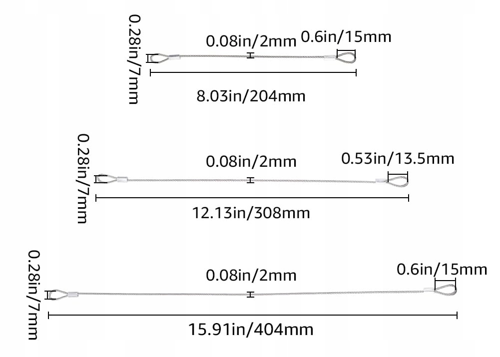 15 предохранительных крючков с тросом: Предохранительные крючки с тросом доступны в 3 стилях, по 5 шт./стилей в каждом, всего 15 шт.; 20,4 х 1,1 х 0,5 см (8,03 х 0,43 х 0,2 дюйма), отверстие: 7 х 15 мм; 30,8 х 1,1 х 0,5 см (12,13 х 0,43 х 0,2 дюйма), отверстие: 7 х 13,5 мм; 40,4 x 1,1 x 0,5 см (15,91 x 0,43 x 0,2 дюйма), отверстие: 7 x 15 мм