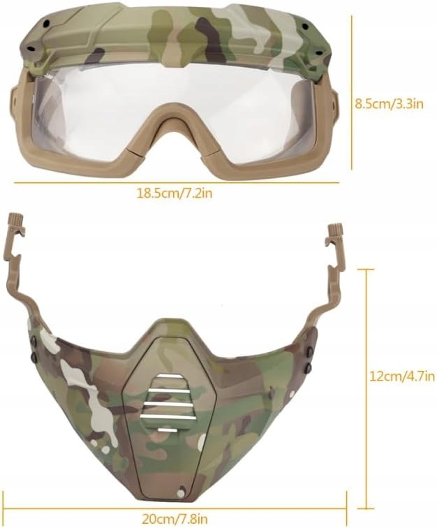 Материалы линз TPE ABS и PC обладают хорошей износостойкостью, сопротивлением скольжению и амортизирующими свойствами. Размер очков 185 х 85 см, подходит для разного размера головы. Размер маски 20 х 12 см подходит для разного размера головы. Тактические очки легкие, ветронепроницаемые, пыленепроницаемые и брызгозащищенные, обеспечивая отличную защиту глаз. Очки и маски можно использовать со шлемами FAST или отдельно. Маска имеет ударопрочность не менее 600 кадров в секунду, а очки обеспечивают адекватную защиту от BB до 310 кадров в секунду. Идеально подходит для занятий спортом на открытом воздухе и других видов деятельности, таких как стрельба из пневматического оружия, пейнтбол, охота и езда на снегоходах, езда на велосипеде на Хэллоуин.