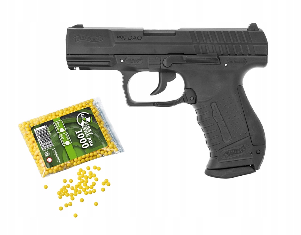 Walther P99 DAO - мощная копия страйкбола CO2, газовая система Blow-Back, металлический замок, магазин емкостью 15 шариков, 520 fps, сила 2J + 1000 шариков 0,12 г + ЗАЩИТНЫЕ СТЕКЛА