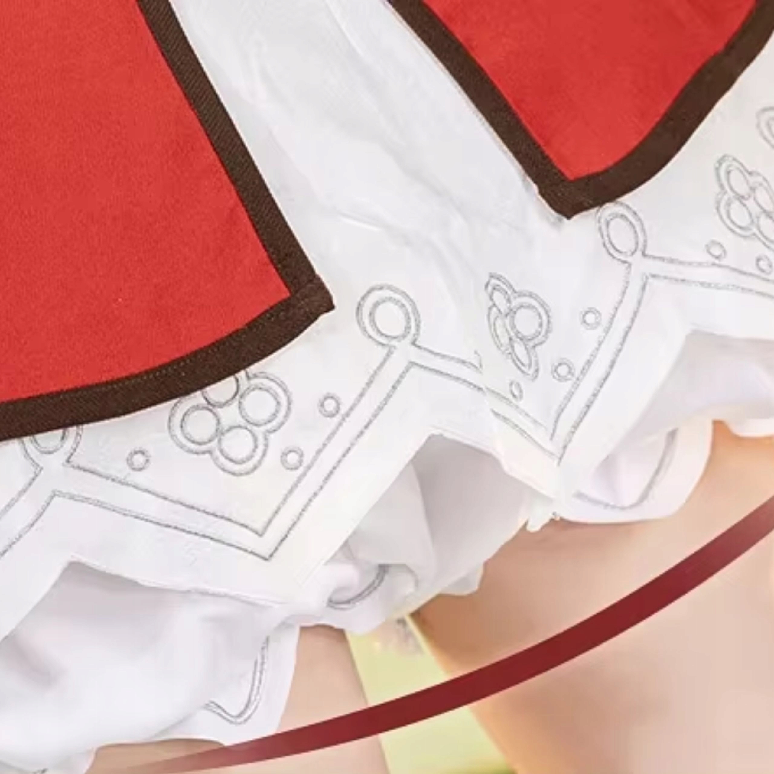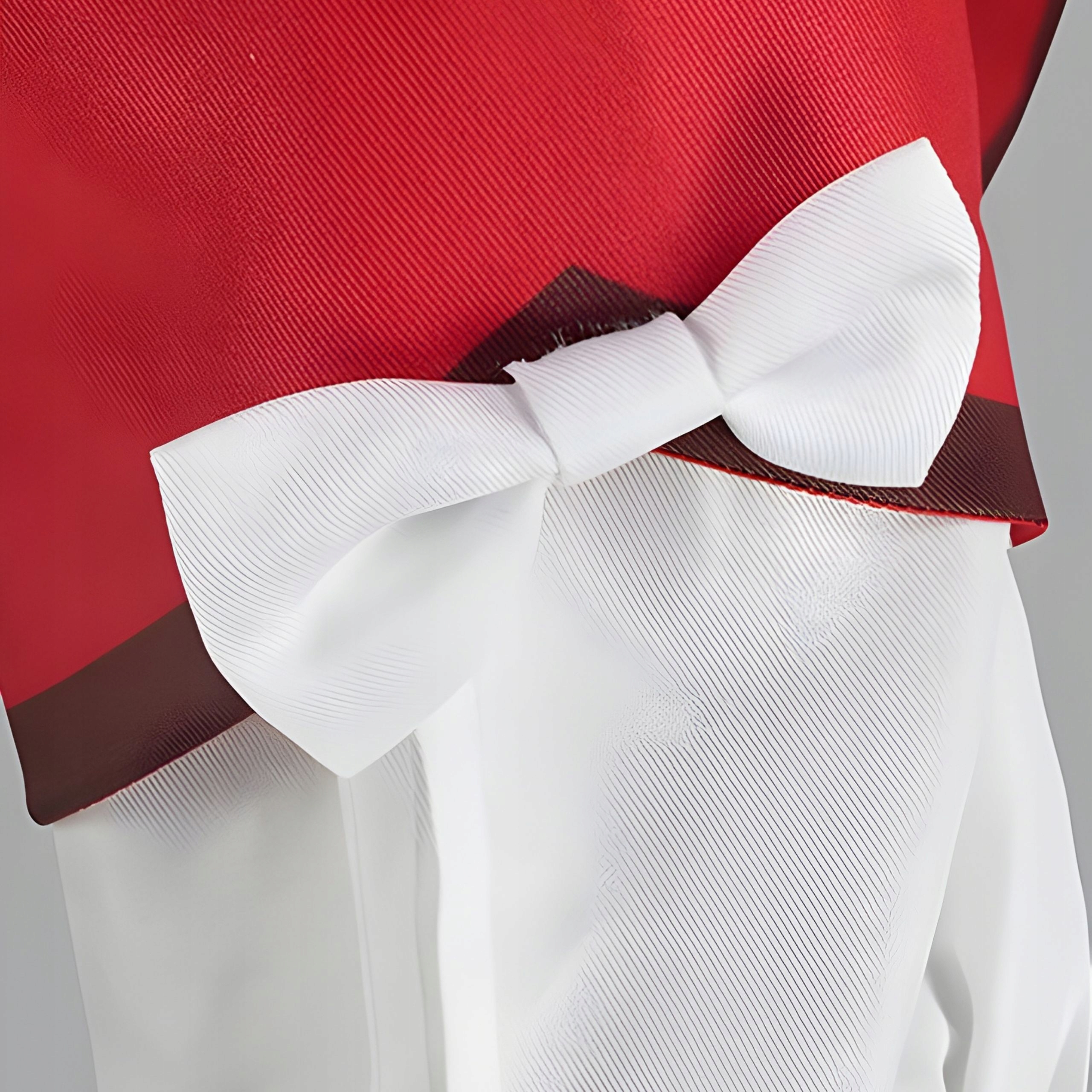 - Наряд выполнен из красивых, ярких материалов, в оттенках белого, красного и коричневого,