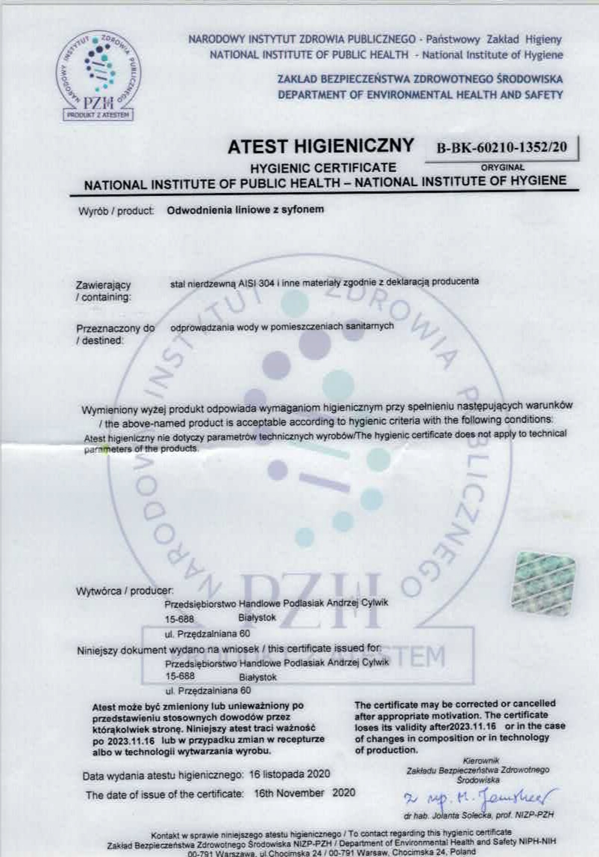 Инвестируя в наши сертифицированные линейные трапы, вы не только выбираете высококачественный и современный продукт, но и все вы заботитесь о безопасности и здоровье себя и своей семьи. Мы призываем вас избегать подделок низкого качества, которые могут не соответствовать польским стандартам безопасности и гигиены.