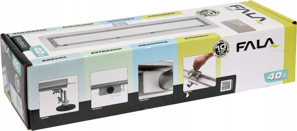 <р> Он изготовлен полностью из нержавеющей стали AISI 304, которая отличается стойкостью к коррозии, моющим средствам и механическим повреждениям. <р> Душевые трапы Fala оснащены оборудованием, гарантирующим комфортную и эффективную работу на долгие годы: <р> - SMARTthru – специальное смотровое окошко означает 100% контроль проходимости и удобную очистку: <р> - EASYclean – легко содержать в чистоте благодаря крючку, входящему в комплект: <р> - GRIPstrong – ручки, стабилизирующие корпус, дополнительное придание жесткости конструкции в полу: <р> - HYDROcloth – уплотнительный коврик входит в комплект – необходимая деталь для гидроизоляции: <р> - STRAINer – эффективное и долговечное сито, предотвращающее засорение сифона и облегчающее постоянную эксплуатацию слива: <р> - HQwelding – качественные прецизионные сварные швы, гарантирующие герметичность слива: <р> - EXTRAslim – изготовлен из нержавеющей стали AISI 304 с очень низким сифоном, что облегчает установку: <р> - EASYfix – широкий диапазон регулировок по высоте, позволяющий подстроить слив под поверхность пола. <р> Вы можете установить водосток Фала без забот — на все наши водостоки предоставляется гарантия 10 лет! <р> Данные: <р> - длина желоба: 40 см <р> - рисунок сетки – Мадейра (плитка под приклеивание) <р> - материал: нержавеющая сталь AISI 304 <р> - ширина: 70 мм (дополнительно воротник примерно по 2 см с каждой стороны) <р> - высота сифона: 52 ммЦель/использование