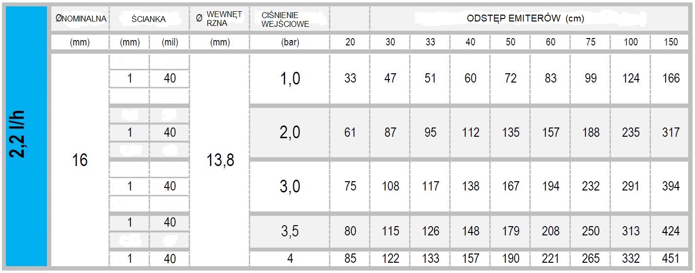 Давайте посмотрим на компенсированную капельную линию. В таблице представлена зависимость длины магистрали от давления в системе и расстояния между эмиттерами, которые влияют на падение давления.