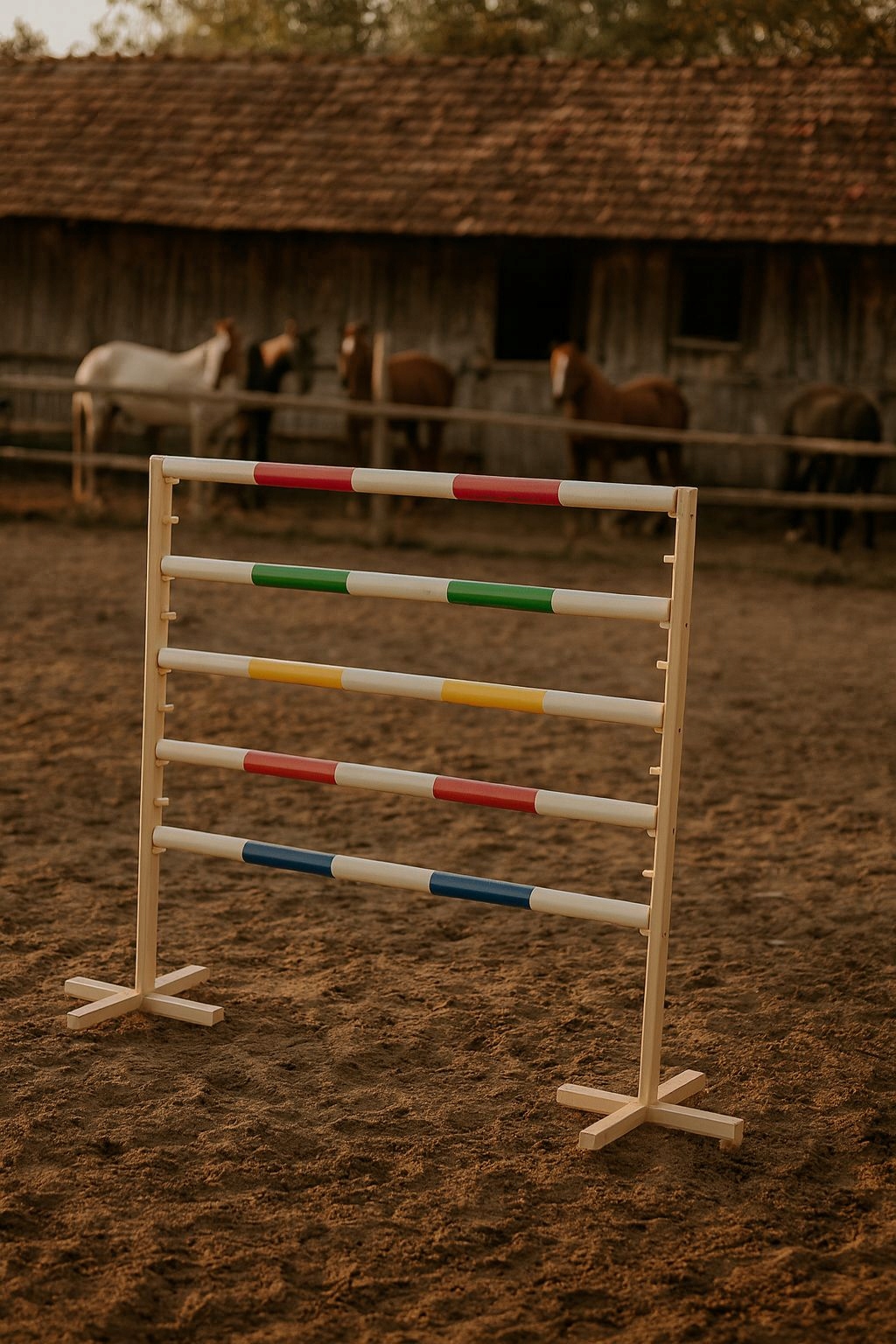 Препятствие прочное и безопасное, изготовлено из идеально отполированной древесины сосны, поэтому ребенок не поранится, перепрыгивая или передвигая подставку. У него устойчивые ножки, благодаря которым он устойчиво стоит. Штанги пластиковые, легкие, доступны в нескольких цветах.