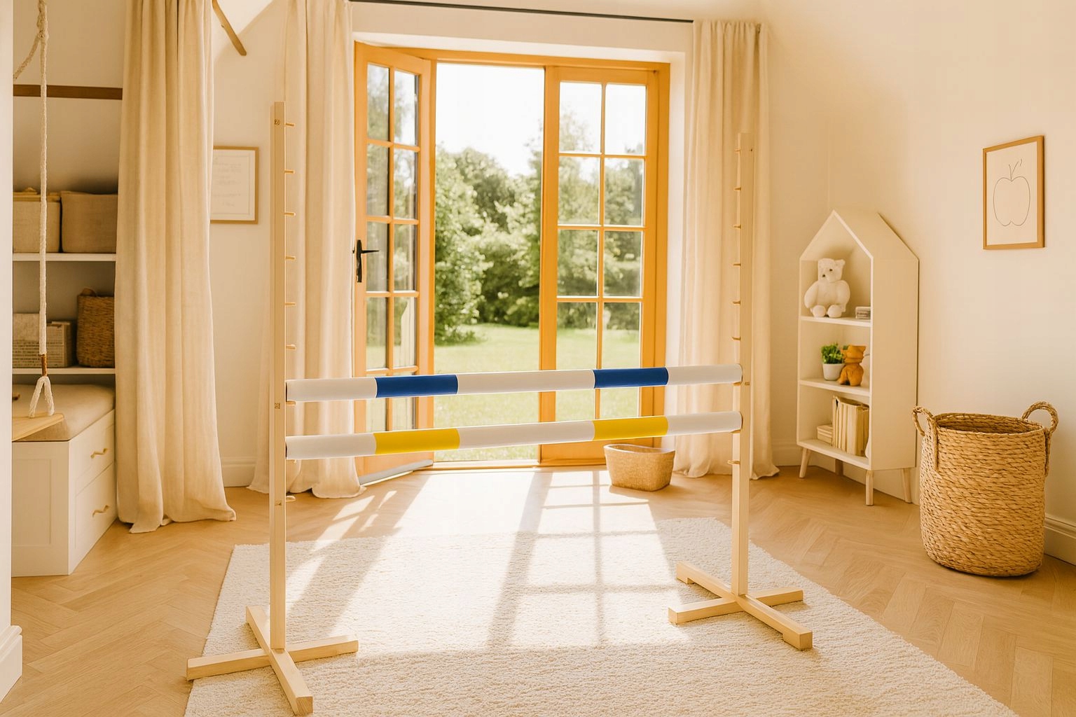 Планки препятствий можно установить на высоте от 40 см до 120 см, в зависимости от роста и двигательных навыков ребенка. Перекладины предназначены для падения при ударе ногой. У ребенка нет возможности упасть во время прыжка.