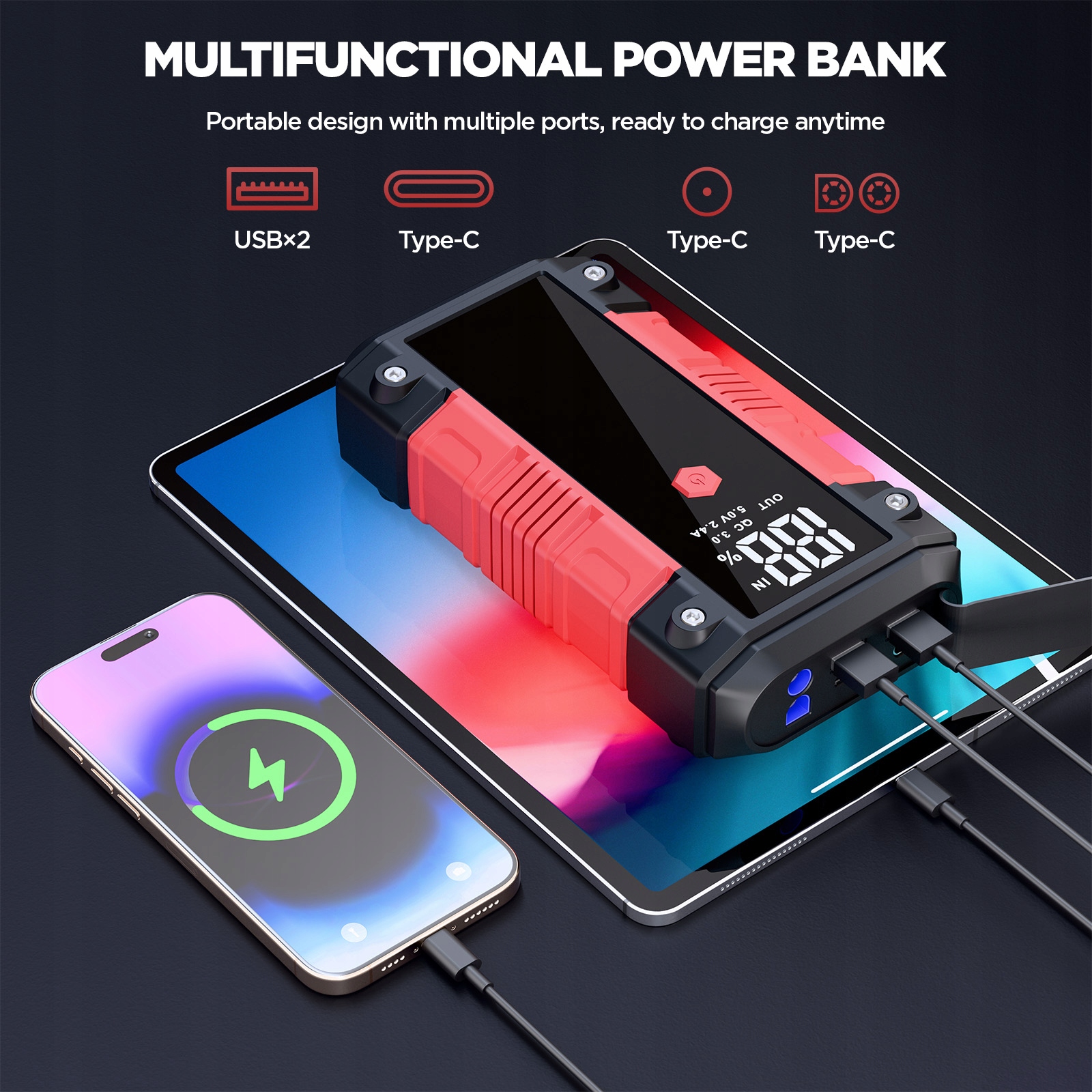 Два USB-выхода (5 В/2,1 А, QC3.0) + порт 12 В/10 А — заряжайте телефоны, планшеты и другие устройства на высокой скорости.