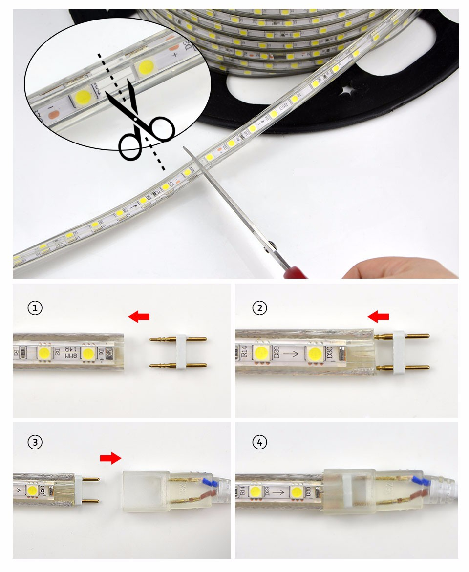 Каждая светодиодная лента 220В - 230В имеет отмеченное место разреза в виде прозрачного разрыва ленты.
