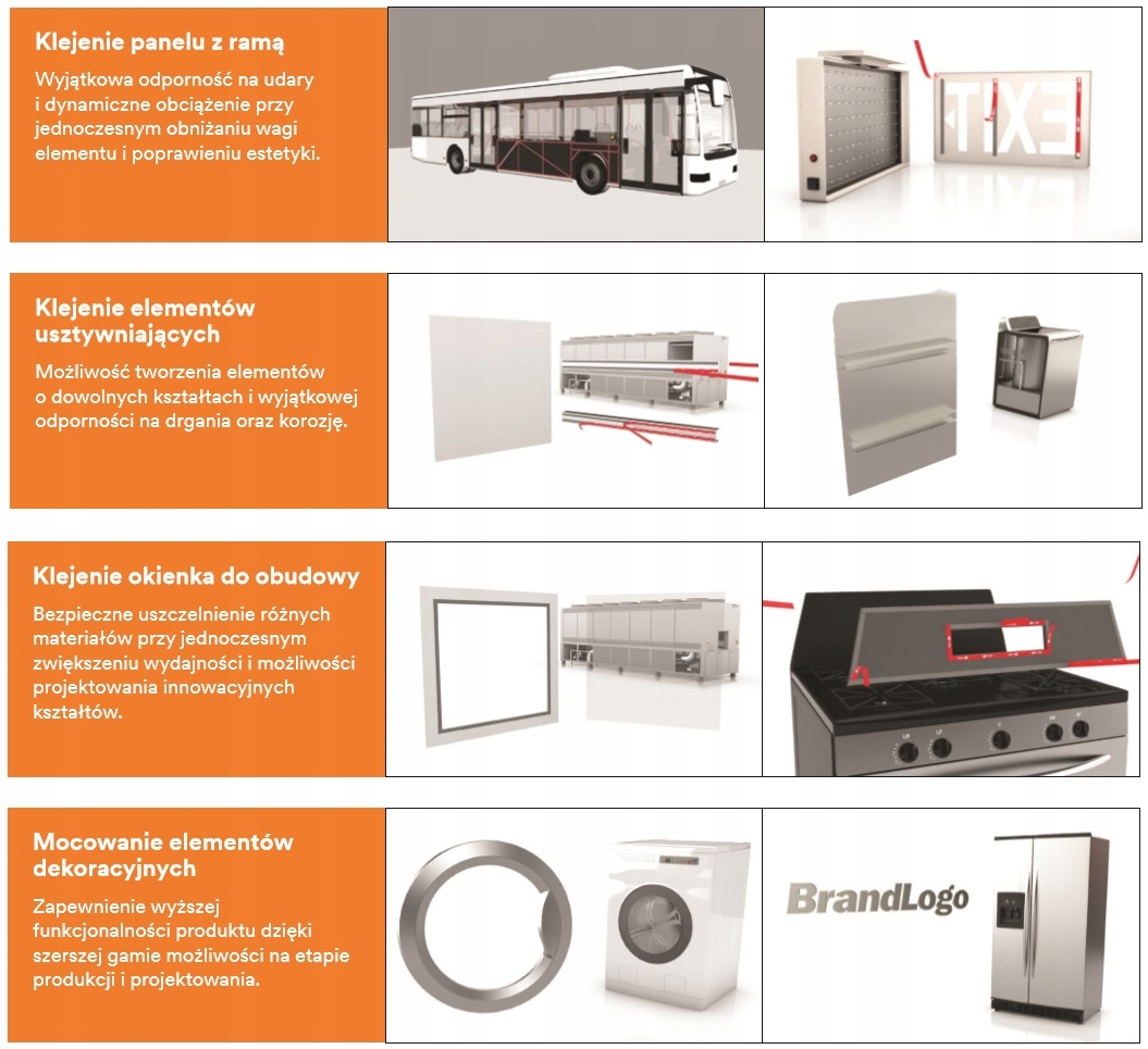 - Применение в различных отраслях, в том числе в транспорте, Automotive, Electronication, в строительстве, в строительстве, домохозяйствах. Помимо общих промышленных применений управляющие панели и жилье, склеивая панель с рамой