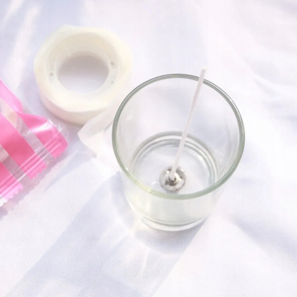 Благодаря кусочкам клея на рулоне вы легко сможете прикрепить фитили в выбранном месте. Приклеиваем клей к пластине фитиля, затем приклеиваем пластину ко дну сосуда, в который собираемся налить горячий парафин, стеарин или воск. Клеевые точки существенно облегчают работу, они стабилизируют положение фитиля во время его остывания.