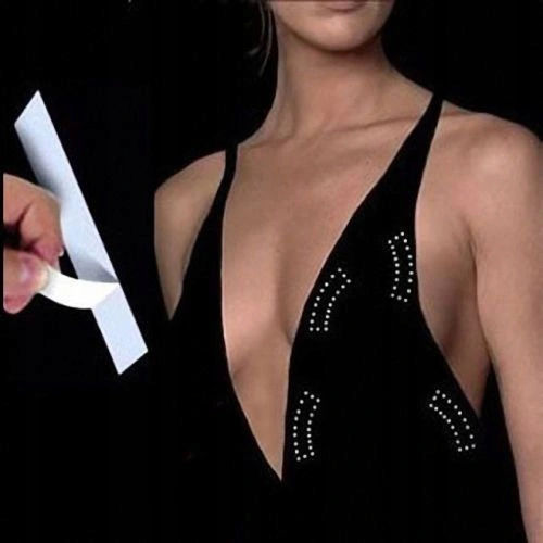 Применяется для фиксации в нужном месте выступающих или падающих непослушных предметов одежды. Можно, для например, приклеиваем им платье без бретелей, прогибающуюся в области декольте ткань, спадающие бретели блузки... и т. д. Приклеиваете одной стороной к ткани, а другой стороной к сухой коже.