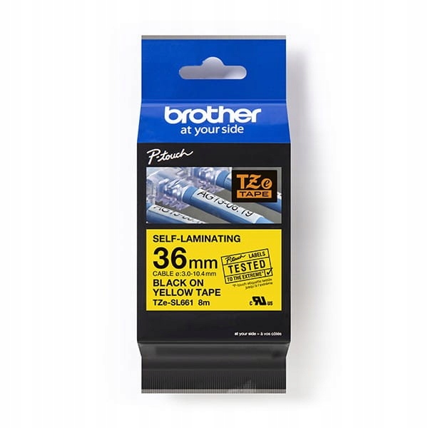 Самоламинирующаяся лента TZe-SL661, черный отпечаток на желтом фоне, разработана с учетом идентификации сети кабели. Он обладает особыми свойствами, которые обеспечивают надежное крепление этикеток к проводам и кабелям. Совместимы с некоторыми моделями устройств P-touch, поддерживающими ленты TZe шириной 36 мм.