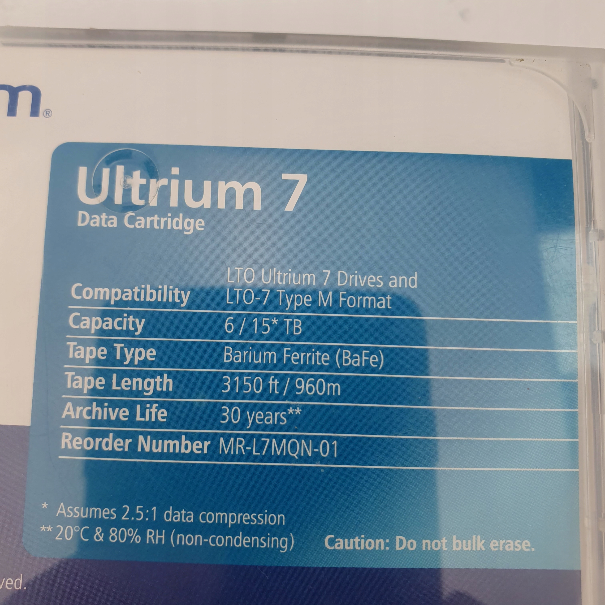 Новое поколение 7 Quantum LTO ( MR-L7MQN-01) имеет более чем вдвое большую емкость ленточного картриджа предыдущего поколения: 6 ТБ в исходном виде, включая до 15 ТБ на картридж в сжатом виде. Большие файлы также будут передаваться быстрее с помощью ленточного картриджа для резервного копирования данных Quantum MR-L7MQN-01 LTO-7, обеспечивающего собственную скорость передачи данных 300 Мбит/с и скорость передачи сжатых данных до 750 МБ в секунду, что может составлять более 2,7 Мбит/с. терабайт данных в час на диск. Кассета рассчитана на сохранение архивного качества до 30 лет.