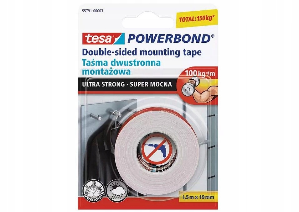 Лента tesa® Powerbond Super Strong — самая прочная из наших двусторонних лент. Разработана специально для обеспечения очень хорошей адгезии к твердым поверхностям, таким как плитка, металл и большинство пластиков. Даже незначительные неровности поверхности не являются проблемой, поскольку лента их выравнивает. Он идеально подходит для постоянного крепления предметов толщиной до 10 мм и весом до 6 кг каждый без необходимости использования молотка или дрели. Удерживает предметы весом до 10 кг на ленте длиной 10 см в оптимальных условиях. Прочный и надежный захват.