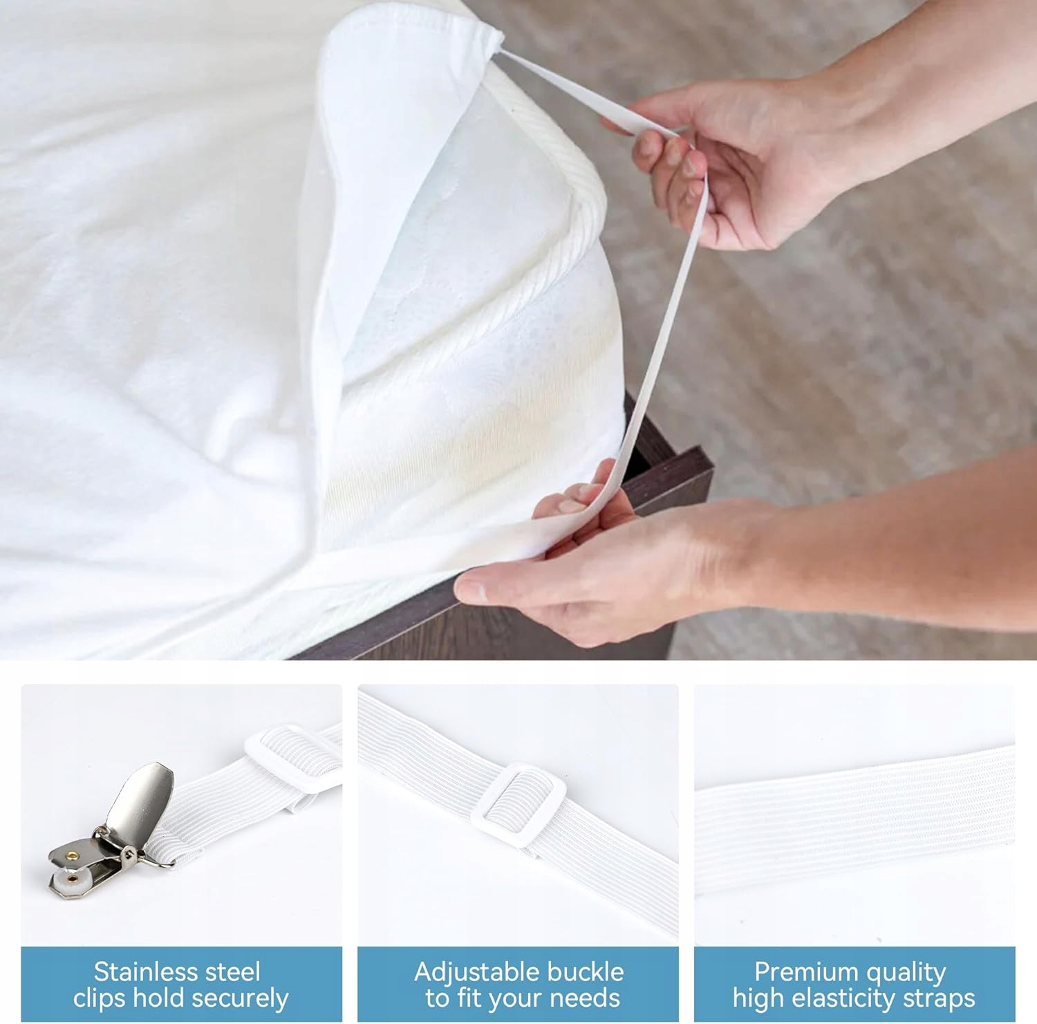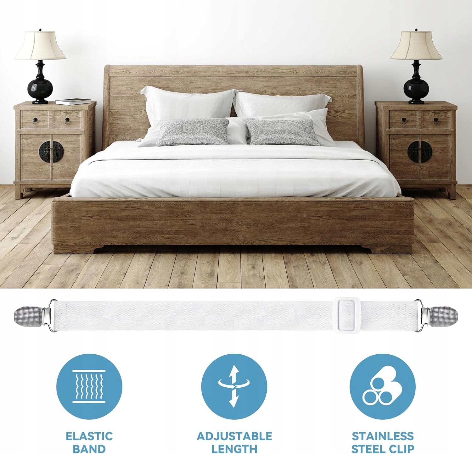 Комплект из четырех лямок, которые затягивают простыню. Длину можно регулировать, что облегчает их регулировку в зависимости от ширины матраса. Прочные зажимы эффективно удерживают простыню на месте, не давая ей соскользнуть с кровати.