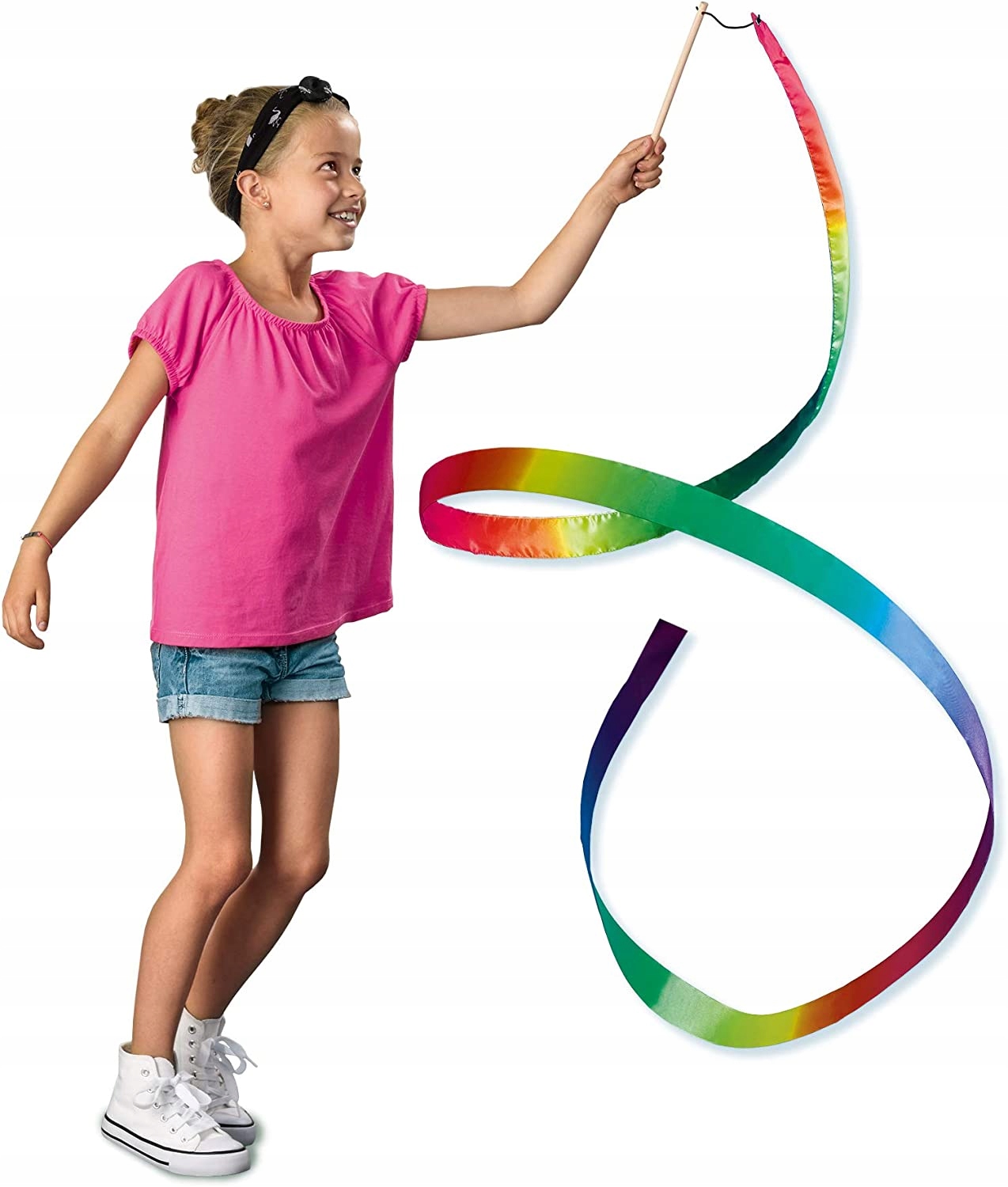 Танцуйте, кружитесь и кружитесь. Играйте и учитесь создавать самые красивые фигурки, используя длинную радужную танцевальную ленту или два танцевальных кольца в руке.