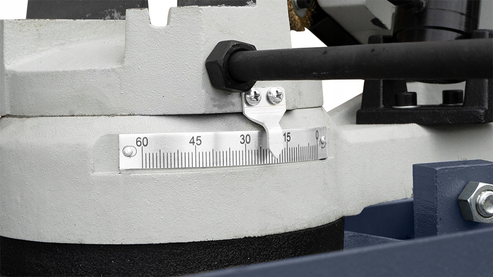 Горизонтальная ленточная пила по металлу с поворотным рычагом позволяет резать в плоскости, перпендикулярной оси разрезаемого материала, и под любым углом в диапазоне от 0 до 60°.