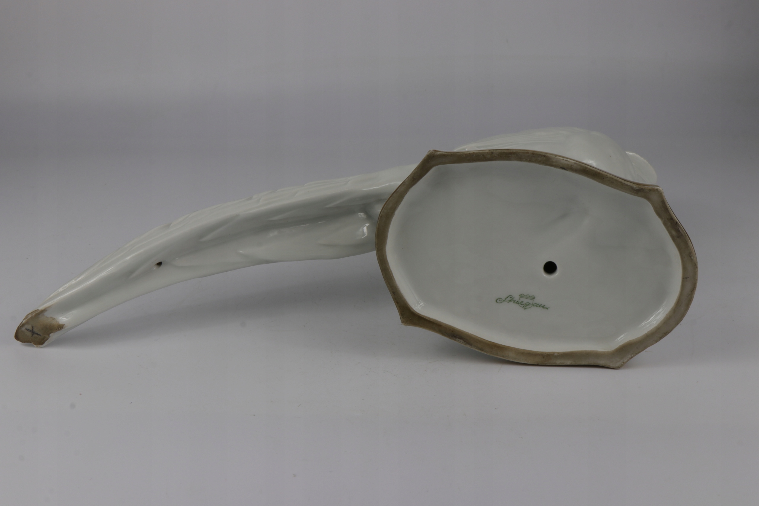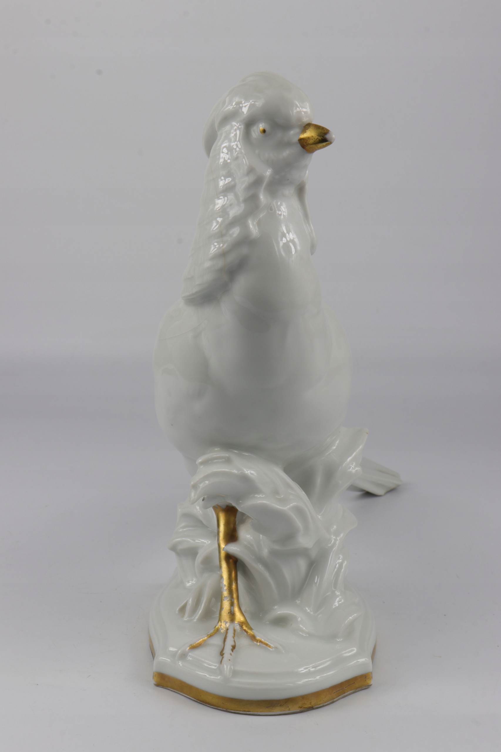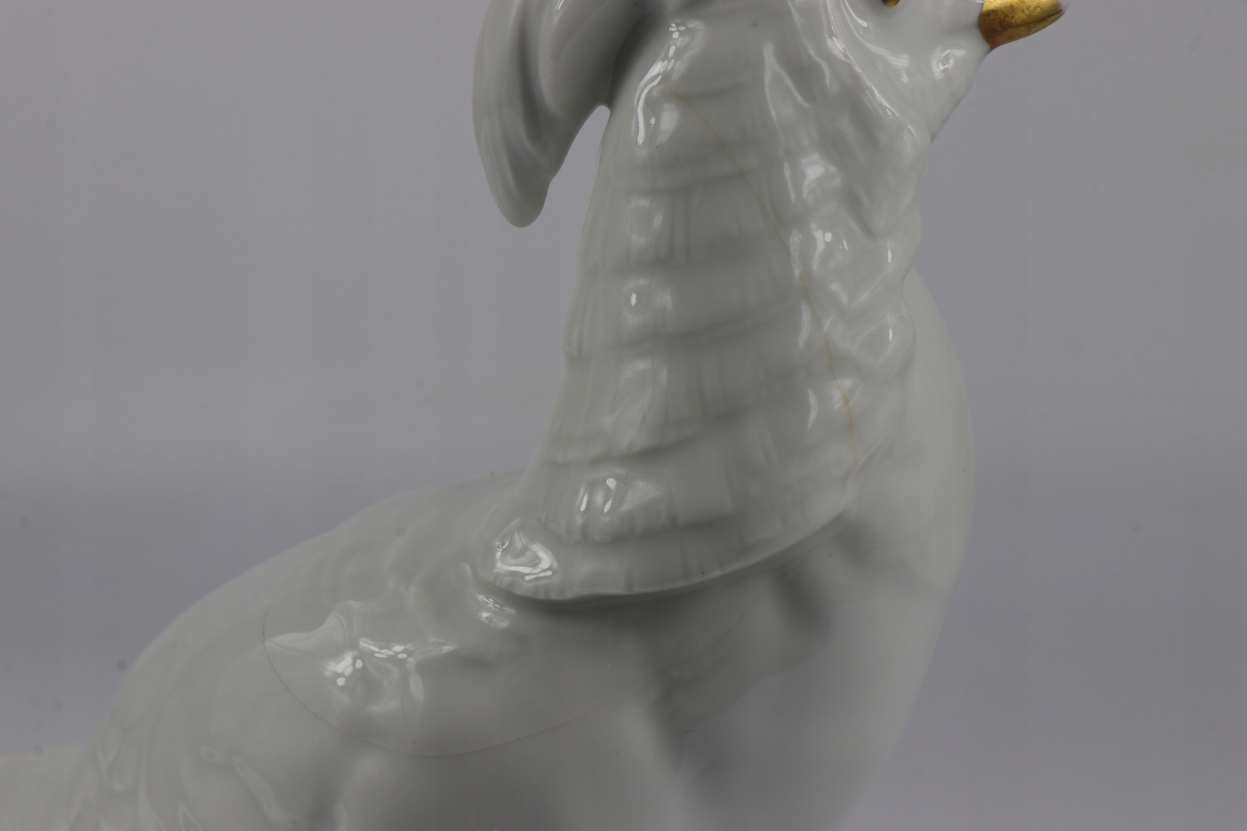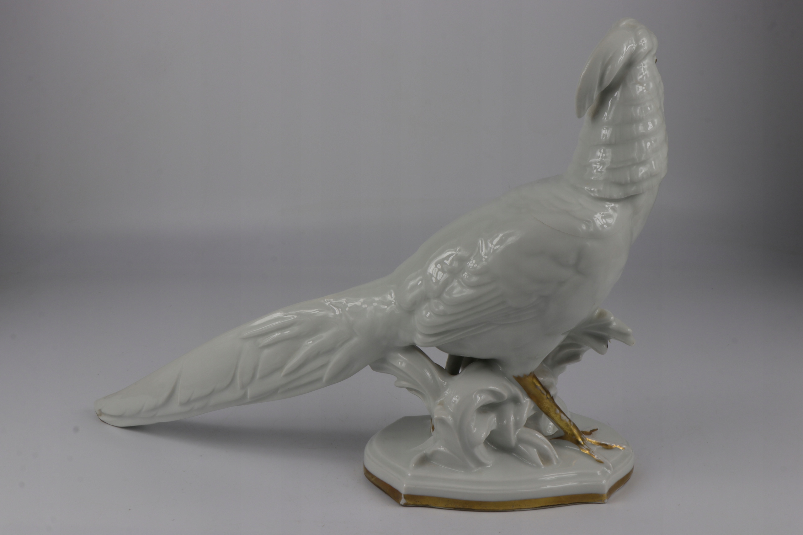 Как видно на фотографиях. Фигура повреждена, видна трещина в глазури, идущая от шеи фазана полукругом к крылу. Единственный недостаток – глазурь, фарфоровый корпус фигурки звучит чисто. Потертости на позолоте. Кроме дефекта глазури, фигурка других дефектов и трещин не имеет.