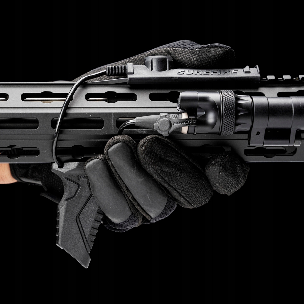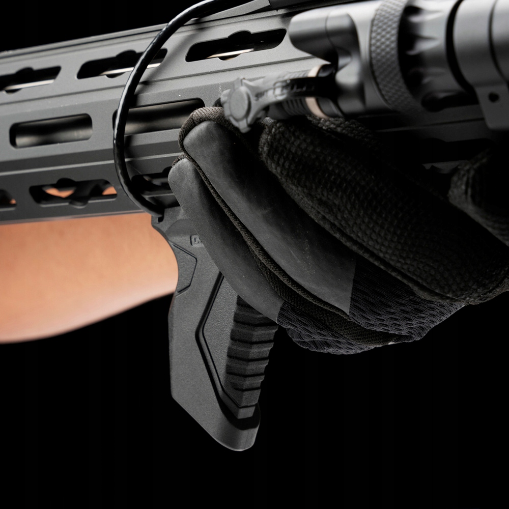 Угловая рукоятка переднего сцепления с системой управления кабелями от Strike Industries склонен под углом, направленным назад, благодаря которой это удобная база при удержании оружия с использованием метода «тянуть» и улучшает контроль при съемке. Формы делают его также передней или задней остановкой баррикады.