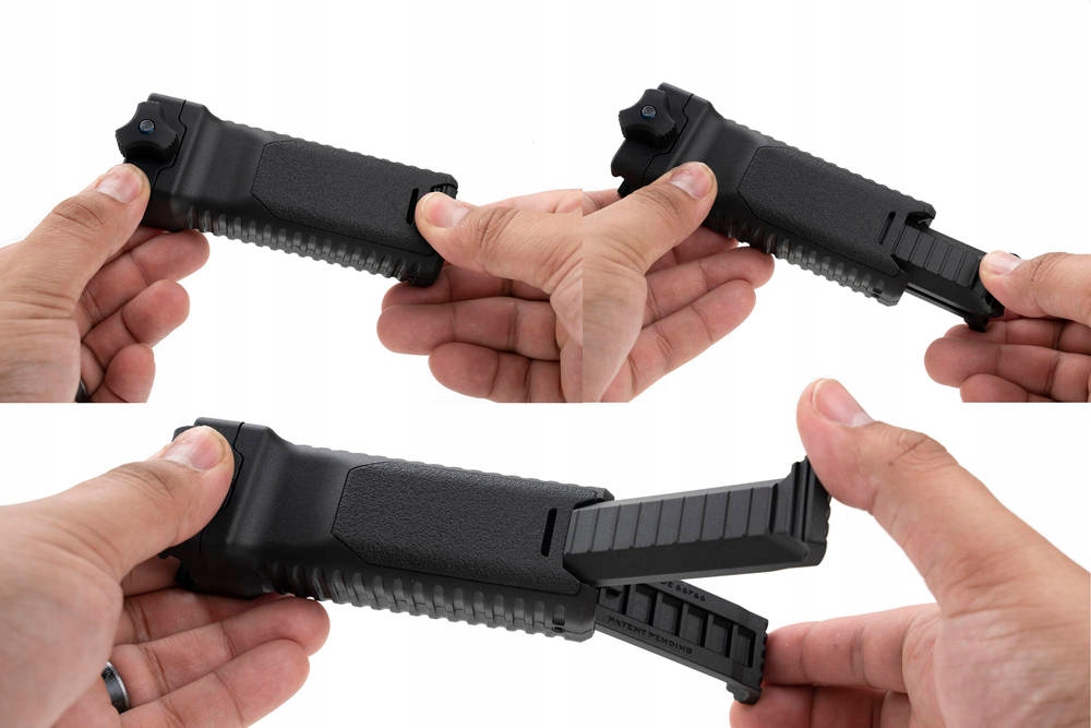 Цевье с выдвижной сошкой. Изготовлен из легкого и прочного полимера. Простой пружинный механизм позволяет быстро разложить сошку, сжав ее нижнюю часть и потянув. Крепление Пикатинни, фиксируемое винтом QD. Он занимает мало места на направляющей, поэтому его можно свободно компоновать с другими аксессуарами.
