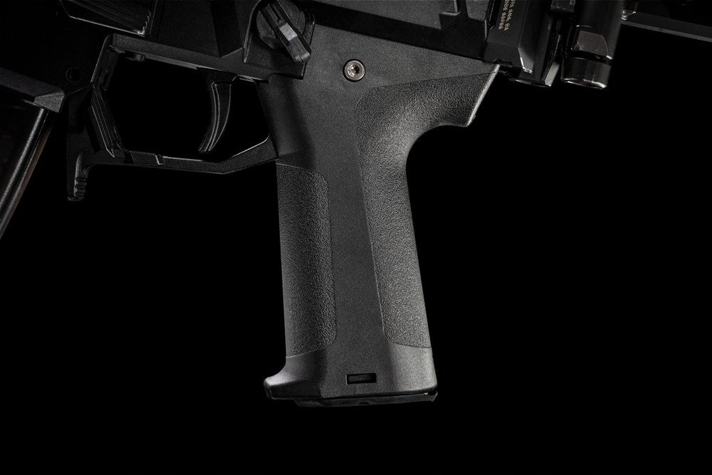 Pistol Pistol Grip Scorpion Evo, отличающийся более вертикальным углом и обозначенными зонами с не -скользящей текстурой, которые могут быть легко изменены путем хранения.