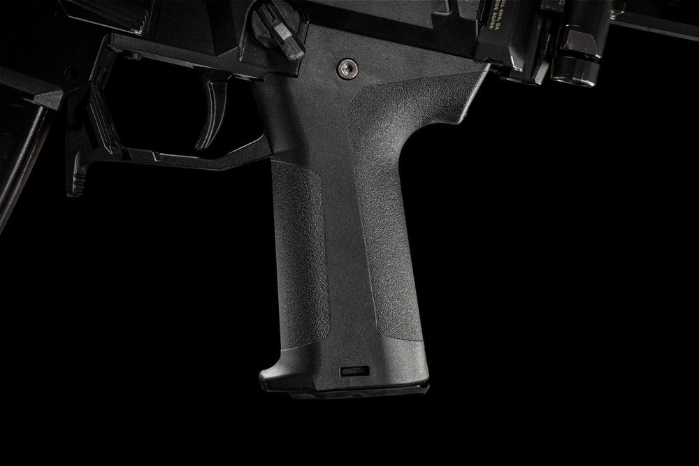 Рукоятка для пистолетов-пулеметов Scorpion EVO, отличающаяся более прямым углом и обозначенными зонами с нескользящей текстурой, легко модифицируемой с помощью насечек.