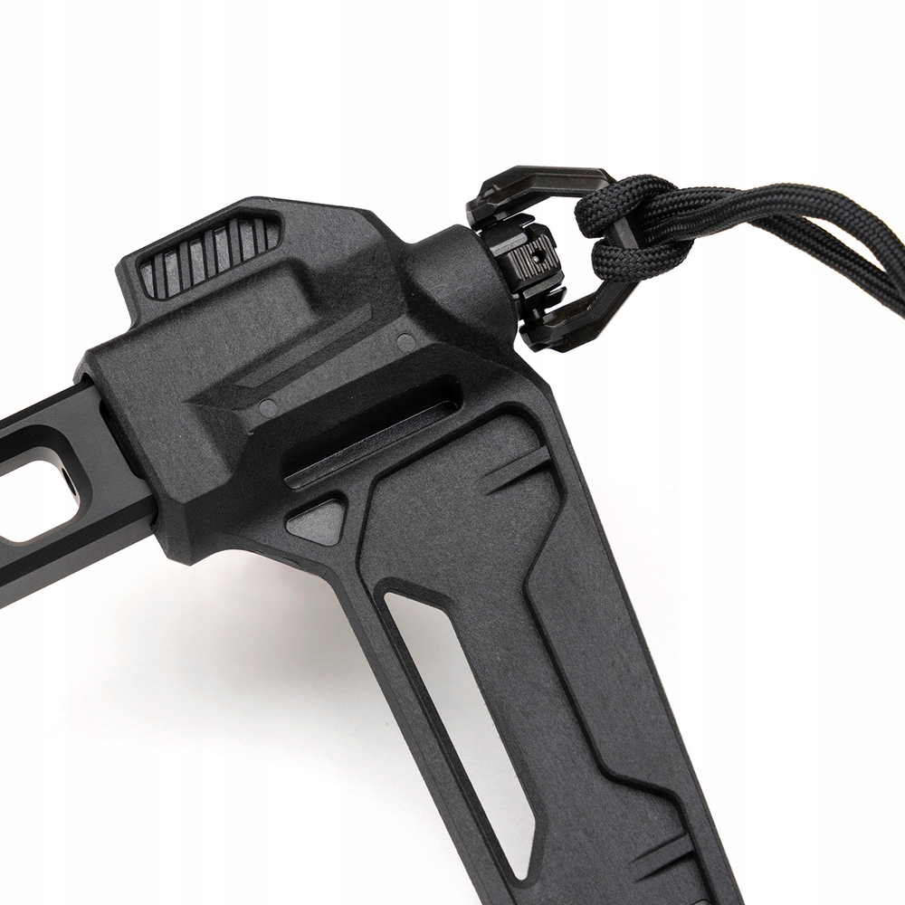 Конструкция приклада обеспечивает высокую эргономику и хорошую поддержку, что важно для правильного захвата цели. Отличительной особенностью этого приклада является двусторонняя система складывания. Он позволяет складывать приклад, когда он не используется, в левую или правую сторону, в зависимости от потребностей пользователя. Простая система блокировки предотвращает случайное складывание или скольжение.