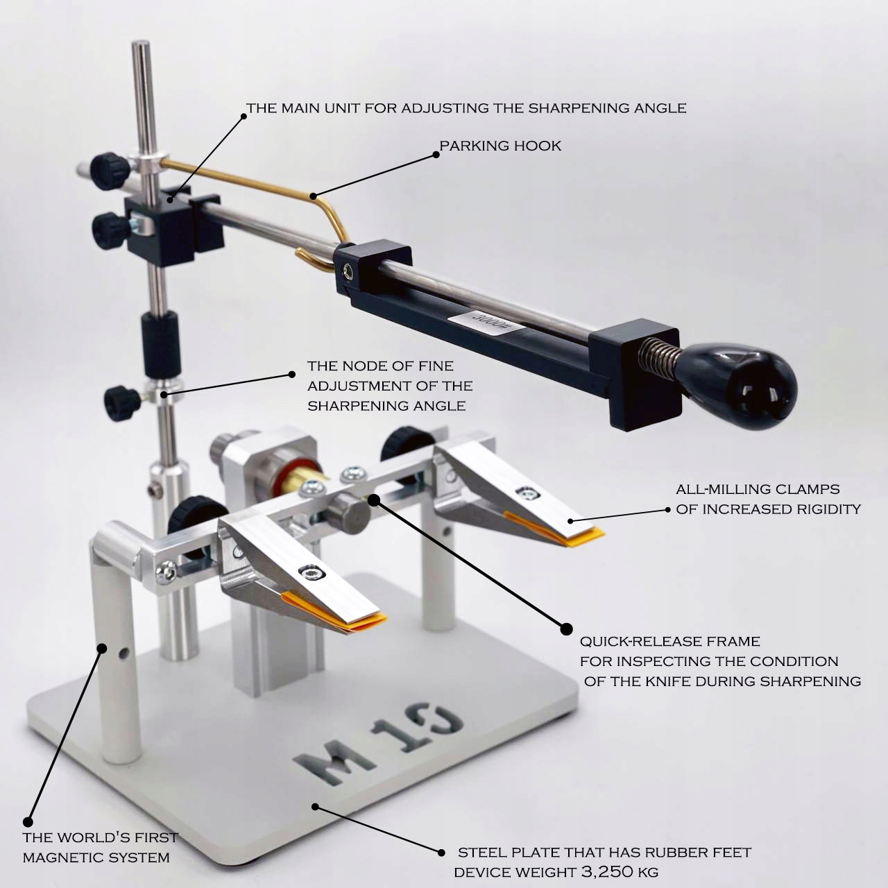 Это устройство учитывает пожелания домашних пользователей и профессионалов заточки устройств. Во-первых, его размеры. Это компактное устройство весом 3230 грамм. Это стабильно. Основание изготовлено из стали и имеет резиновые ножки. Устройство окрашено высококачественной порошковой краской. Это первое в мире устройство с магнитным узлом.