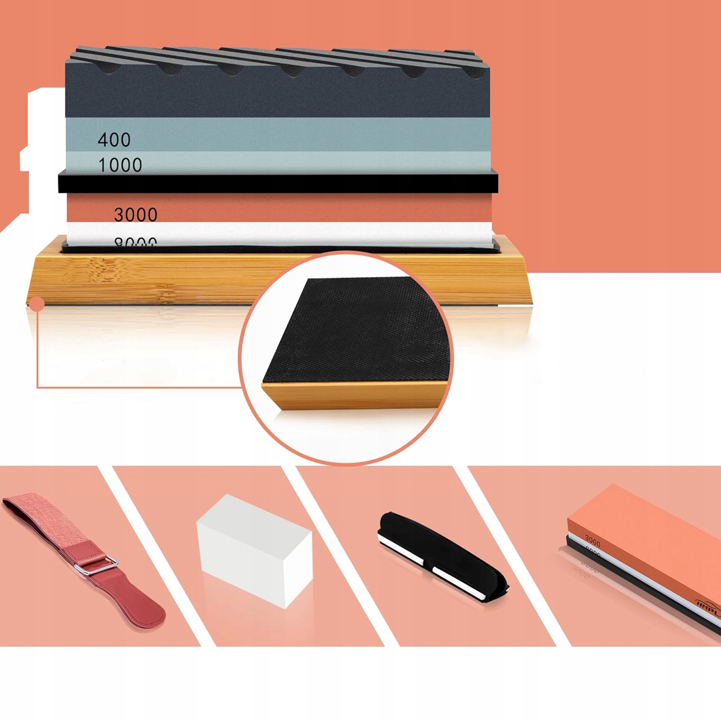 Всегда тупые ножи? Не с этим набором. Благодаря четырем различным градациям камня (от 400 до 8000) вы можете быстро заточить и отполировать лезвие до высокого блеска. Это инструмент, который делает приготовление пищи и работу с острыми предметами удовольствием.