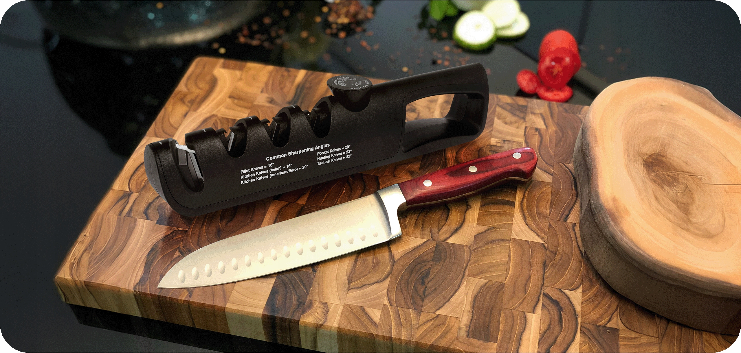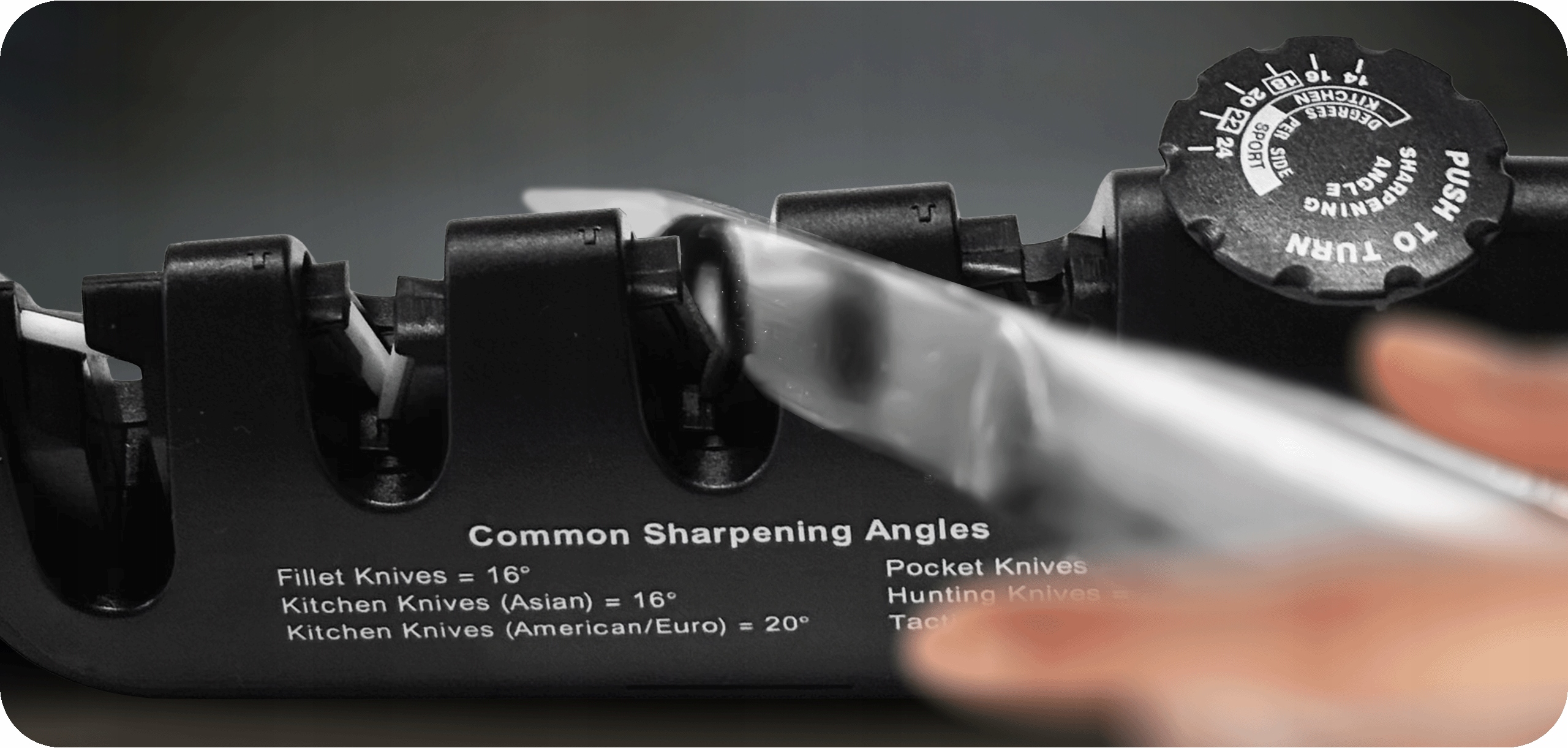 Меньшие углы (около 14°) идеальны для тонких точных кухонных лезвий, большие углы (до 24°) - для более толстых тактических или походных ножей.