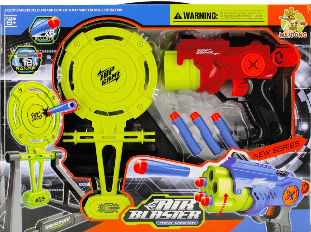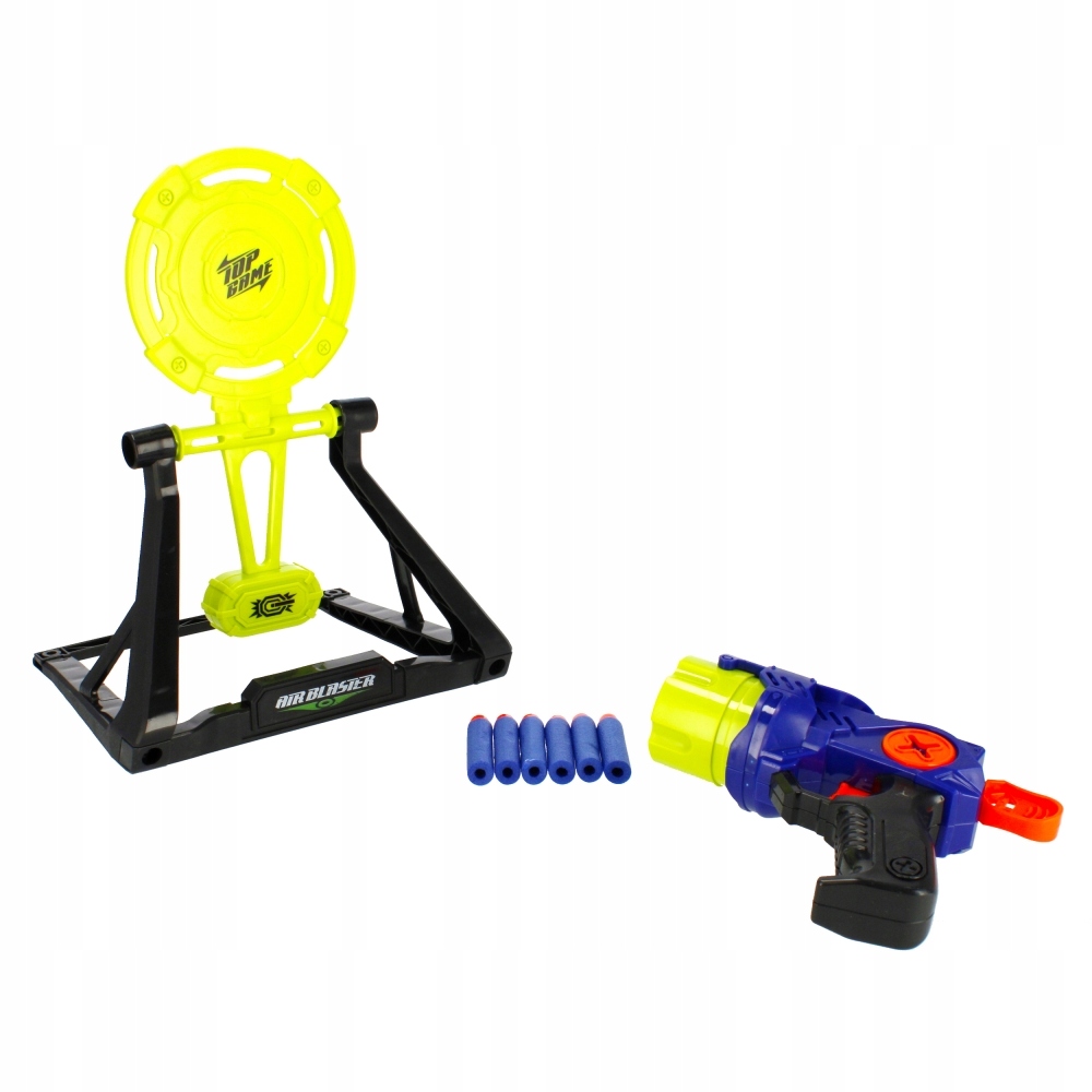 Состав набора: пистолет, 6 совершенно безопасных пенопластовых пуль, мишень для установки. Все сделано из пластика и пенопласта.