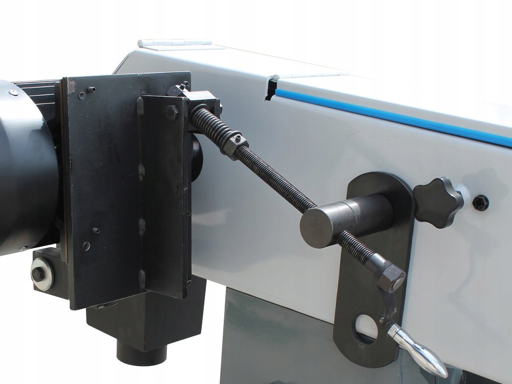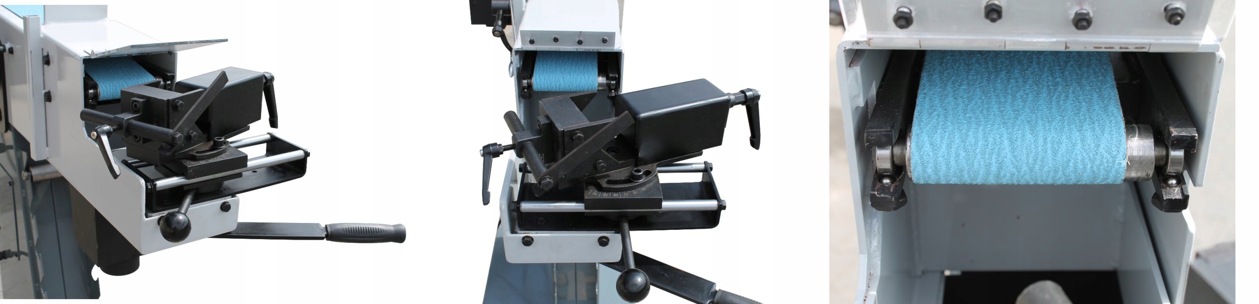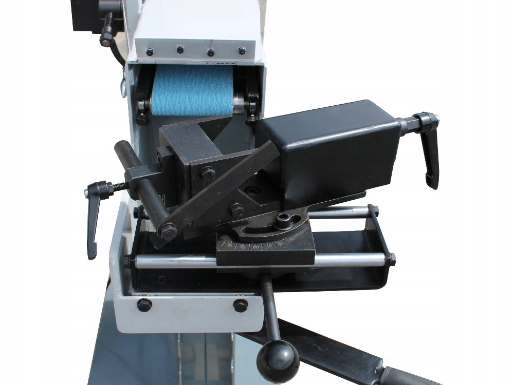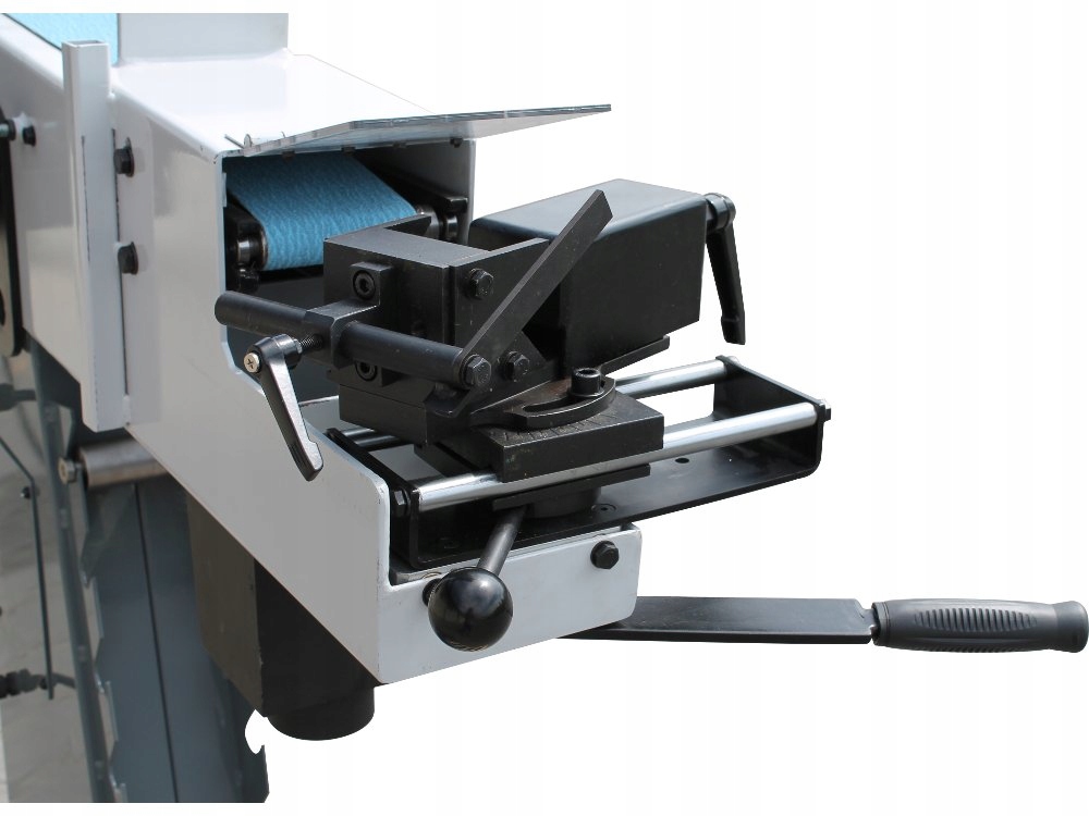 Стол оснащен рычагом, перемещающим тиски с материалом в сторону абразивной ленты, что позволяет точно контролировать глубину шлифовки.