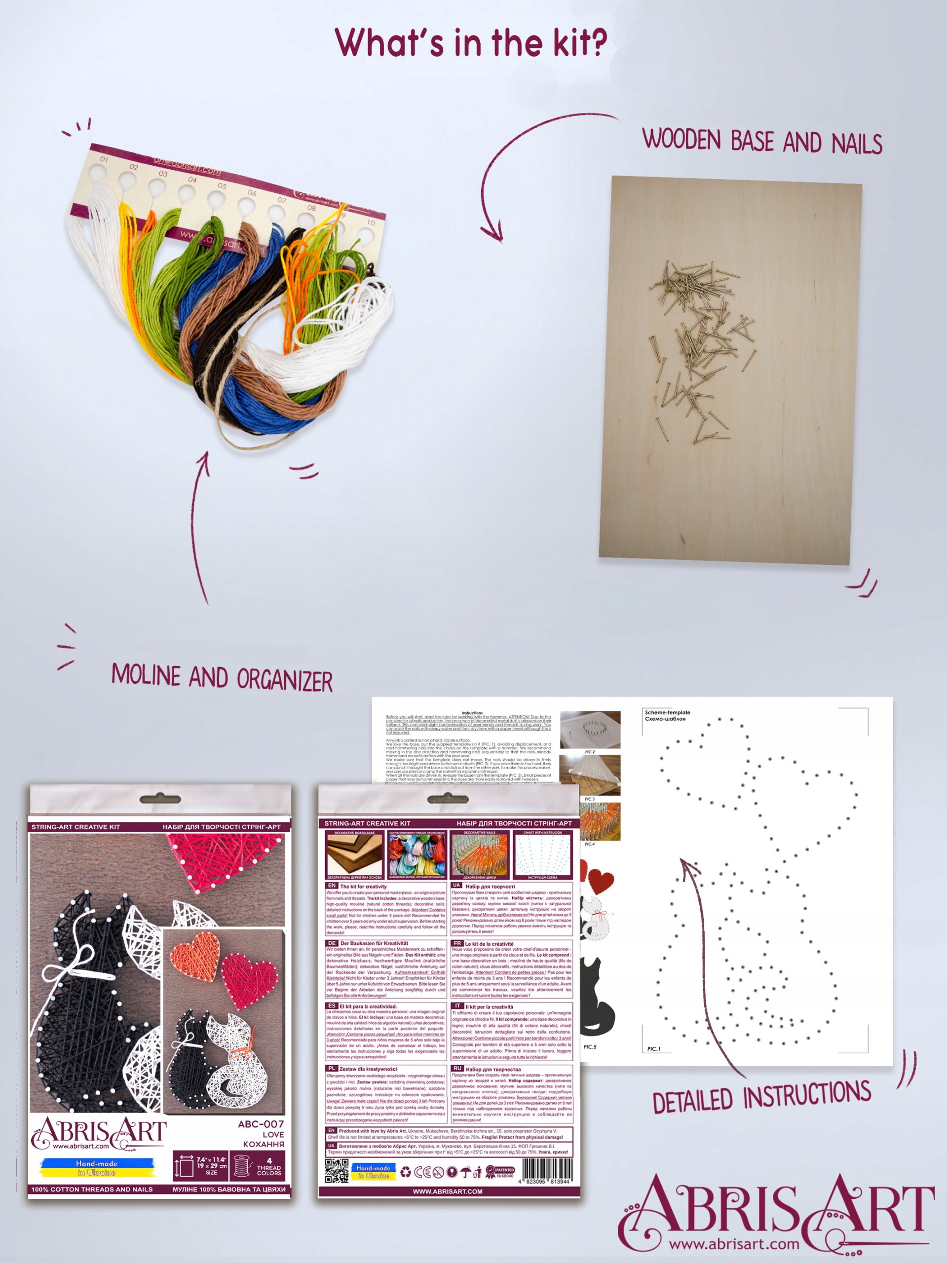 В комплект входят качественные материалы, в том числе деревянная доска, которая служит основой для арт-проекта, гвозди и разнообразные разноцветные нитки. Прилагаемые инструкции проведут вас через процесс создания, облегчая создание шедевра.