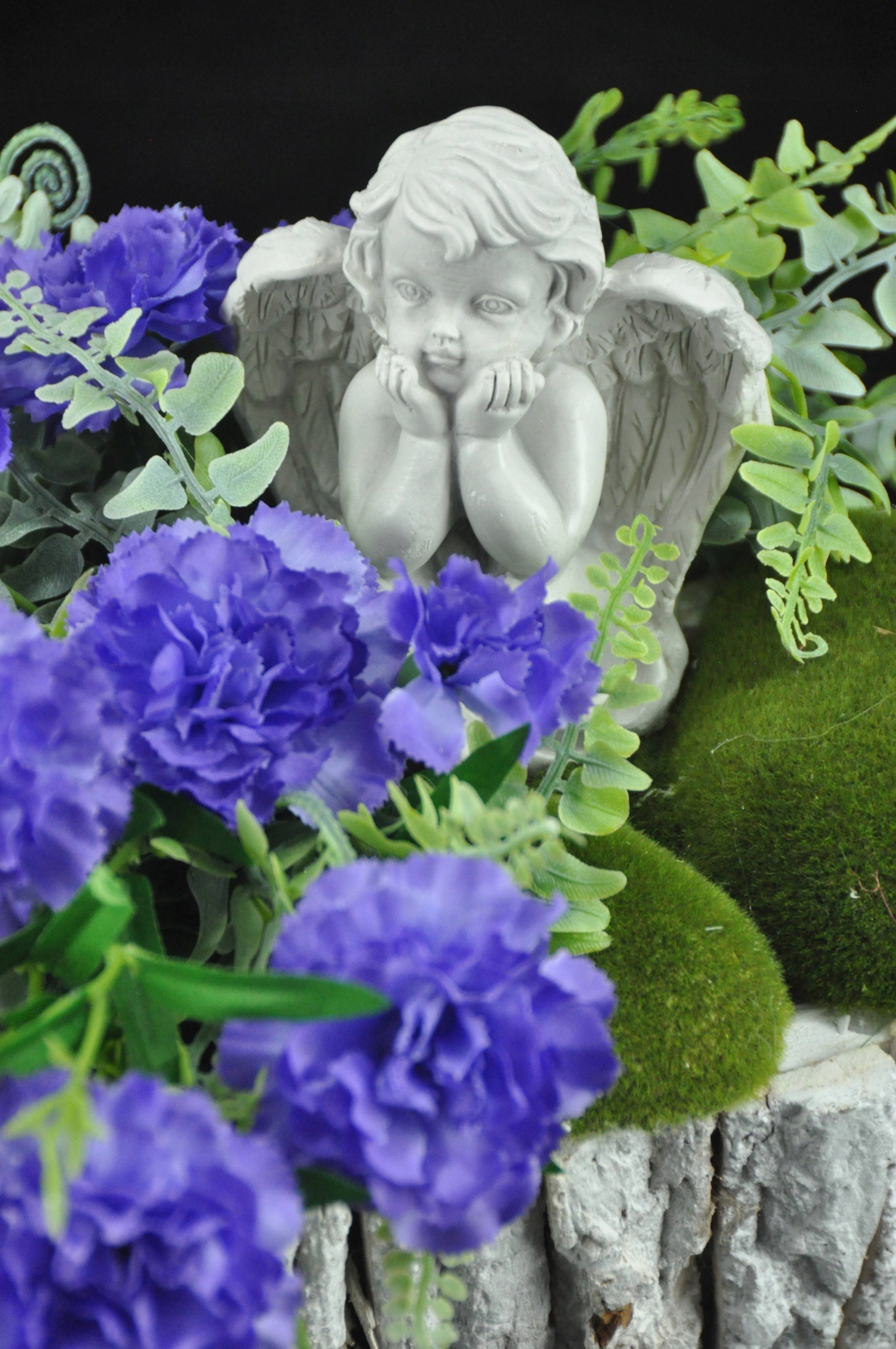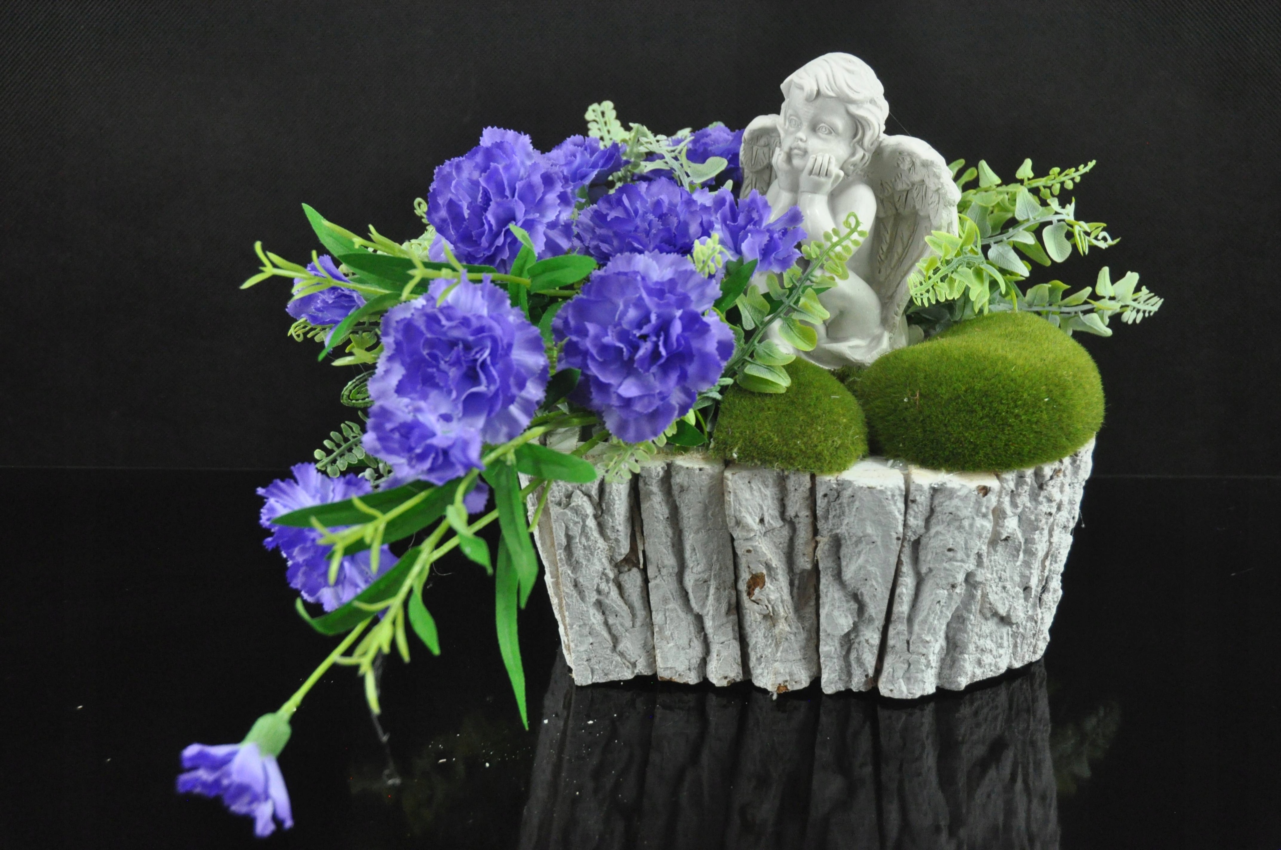 Stroik kompozycja aniołek niebieskie goździki grób cmentarz