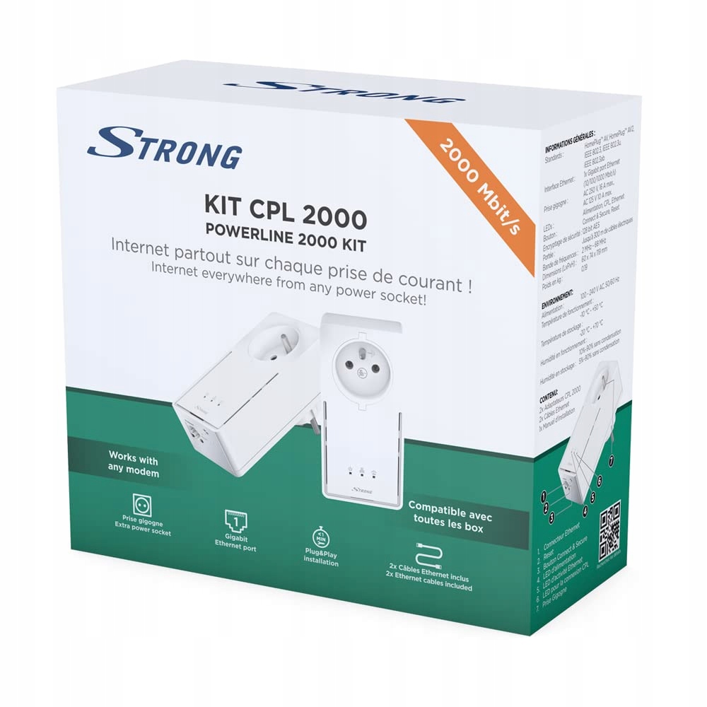 - название элемента: STRONG Набор 2 сокета CPL 2000 Мбит/с, сокет с фильтром и порт Ethernet, совместимый с интернет-приставками, идеально подходит для нескольких телевизоров, потоковая передача HD, без настройки, готов к использованию.