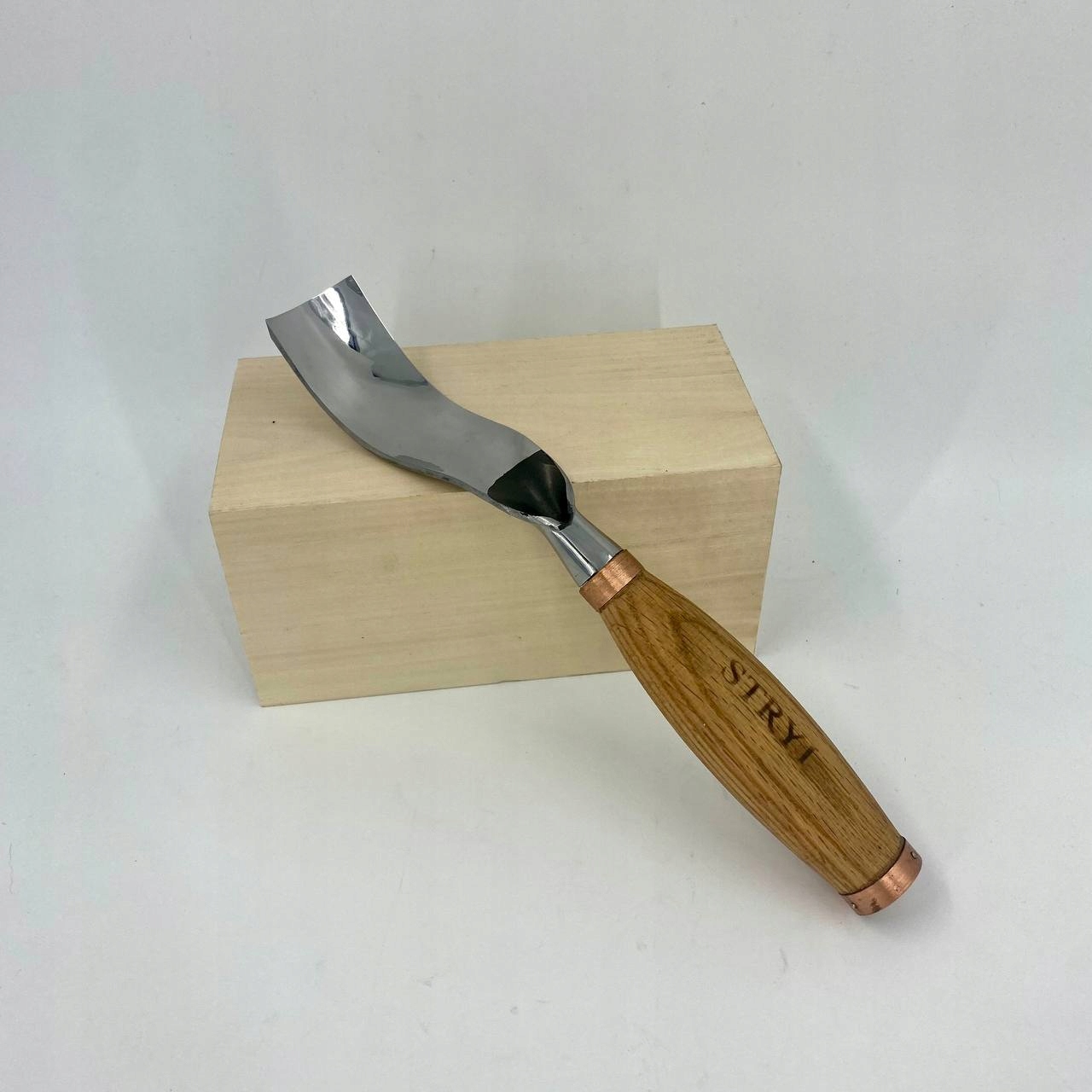 Уникальная изогнутая форма гарантирует превосходный угол подхода, способствуя доступу к твердым деревянным участкам и обеспечению удобных, контролируемых скульптурных движений. Сплошная конструкция ручки, усиленная двумя медными кольцами, гарантирует сопротивление инструмента интенсивной эксплуатации с большими проектами.